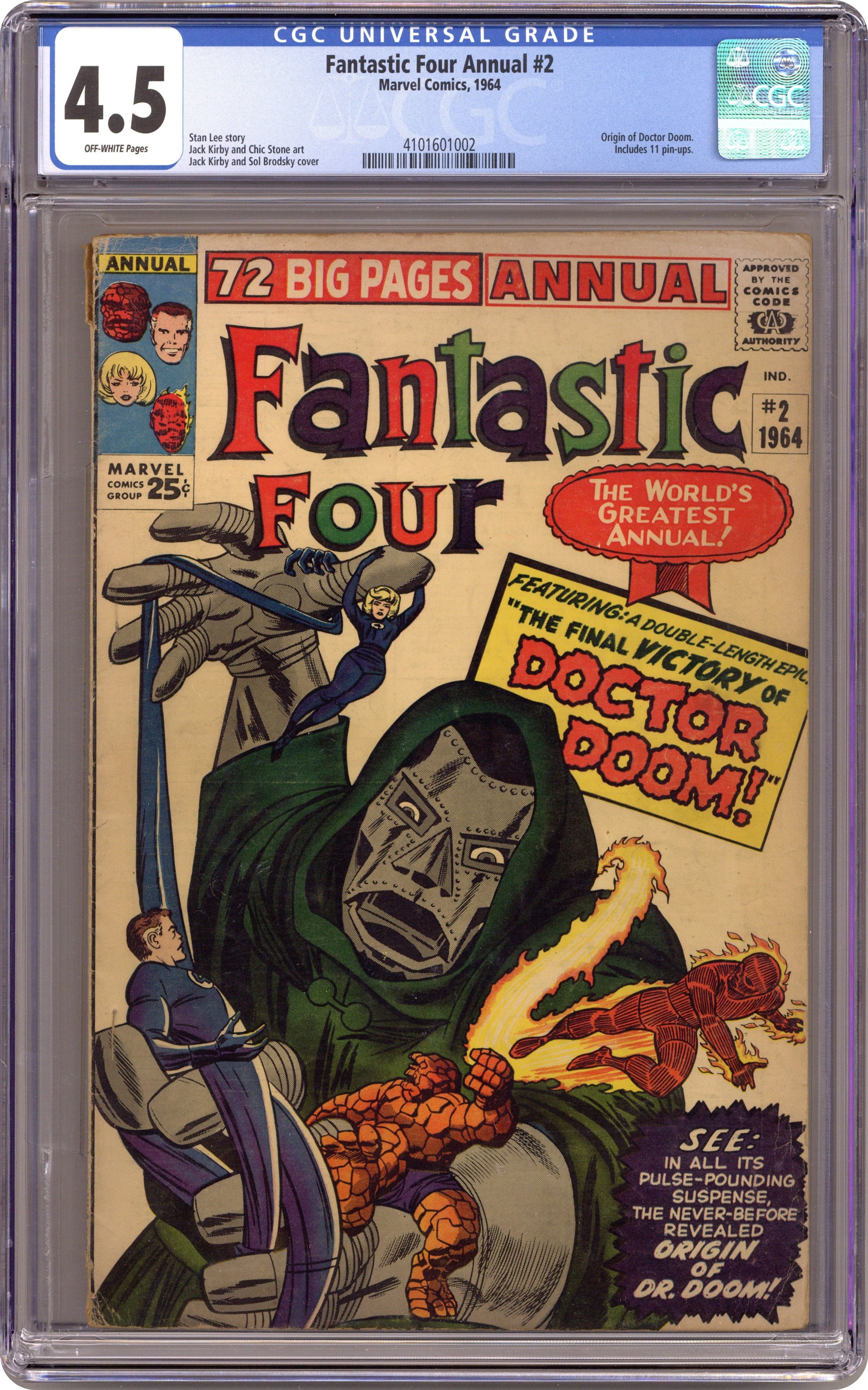Ended Jul 23 2024 Winning Bid $181 2 new Doctor Doom stories, "Origin of Doctor Doom!" and "The Final Victory of Dr. Doom!" Scripts by Stan Lee, pencils by Jack Kirby, inks by Chic Stone. Six pages of pin-ups by Kirby/Sol Brodsky. This issue also reprints "Prisoners of Doctor Doom" (from FF 5). Kirby/Stone cover. 76 pgs. Cover price $0.25. Grade: CGC 4.5 explanation of grade Condition: Used (collectible)