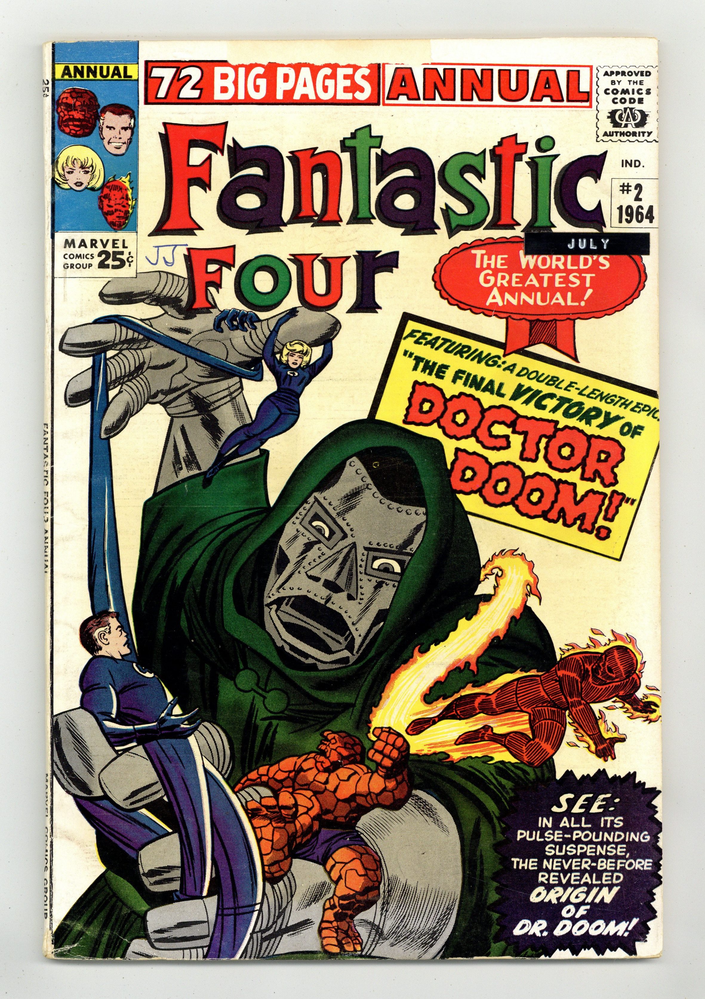 2 new Doctor Doom stories, "Origin of Doctor Doom!" and "The Final Victory of Dr. Doom!" Scripts by Stan Lee, pencils by Jack Kirby, inks by Chic Stone. Six pages of pin-ups by Kirby/Sol Brodsky. This issue also reprints "Prisoners of Doctor Doom" (from FF 5). Kirby/Stone cover. 76 pgs. Cover price $0.25. Grade: VG 4.0 explanation of grade Condition: Used (collectible)