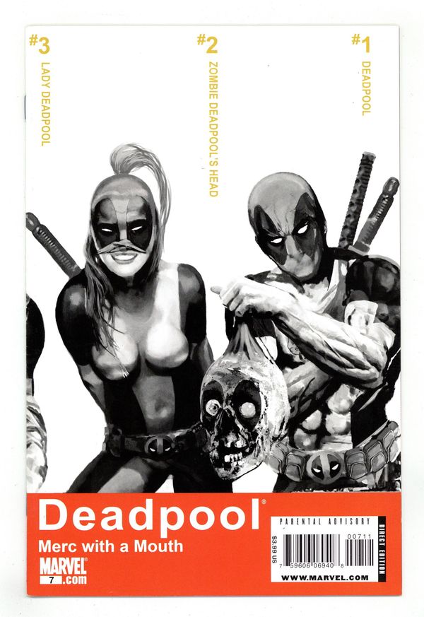 Wraparound Cover by ARTHUR SUYDAM. Written by VICTOR GISCHLER. Art by ROB LIEFELD, KYLE BAKER, DAS PASTORAS and BONG DAZO. 'ARE YOU THERE, DEADPOOL? IT'S ME DEADPOOL.' Special double-sized issue with art by ROB LIEFELD, KYLE BAKER, DAS PASTORAS and regular series artist BONG DAZO. What do you do with a homesick zombie head? Take it back to the zombie universe, of course! Hopping through an interdimensional portal in the Florida swamp with Headpool tucked under his arm, Deadpool soon finds himself bouncing through a series of outlandish alternate realities, each more warped than the last. Wade Wilson, say hello to Major Deadpool, the Deadpool Kid and - va-va-voom - Lady Deadpool. 40 pages, full color. Cover price $3.99. Grade: FN 6.0 explanation of grade Condition: Used (collectible)