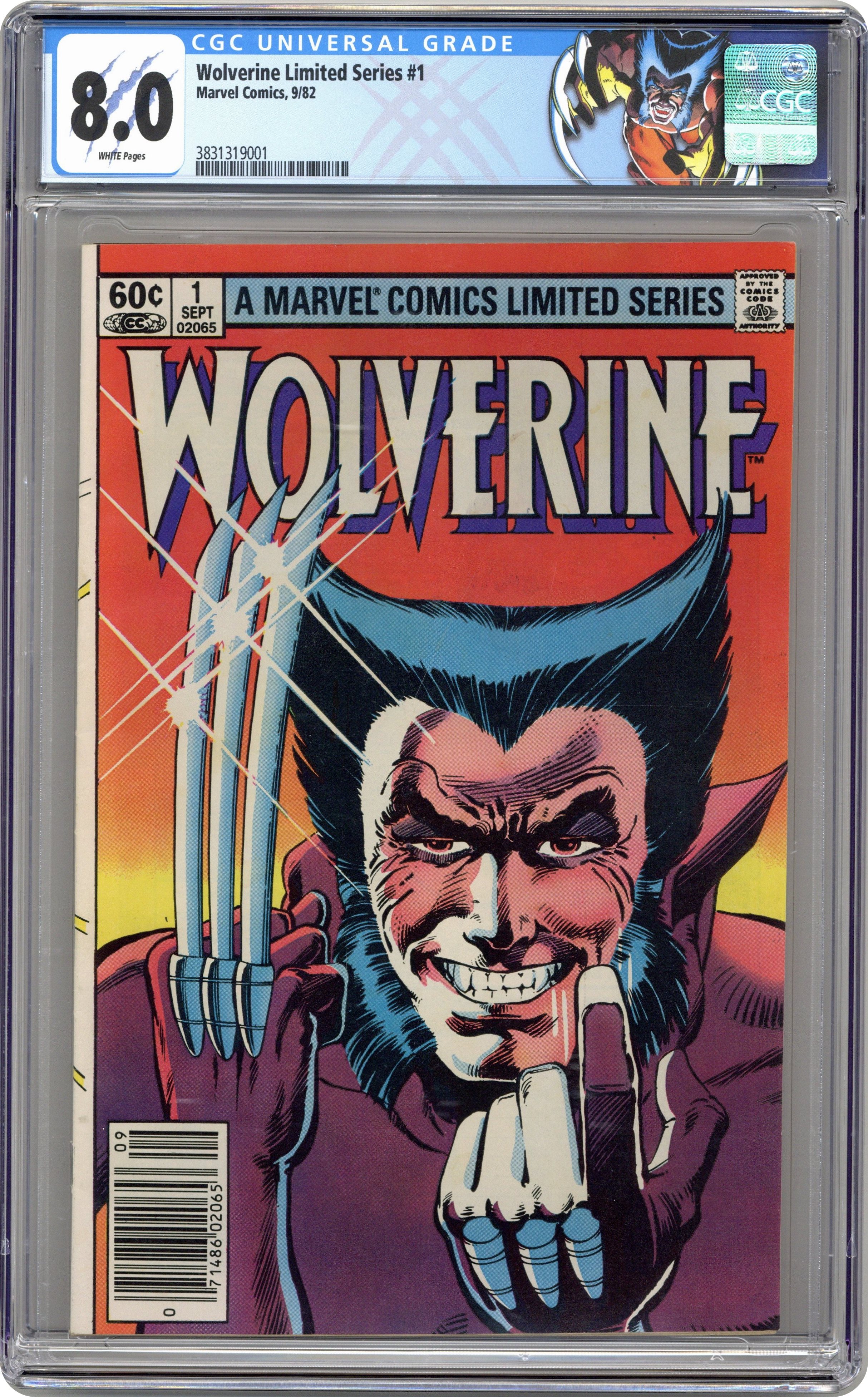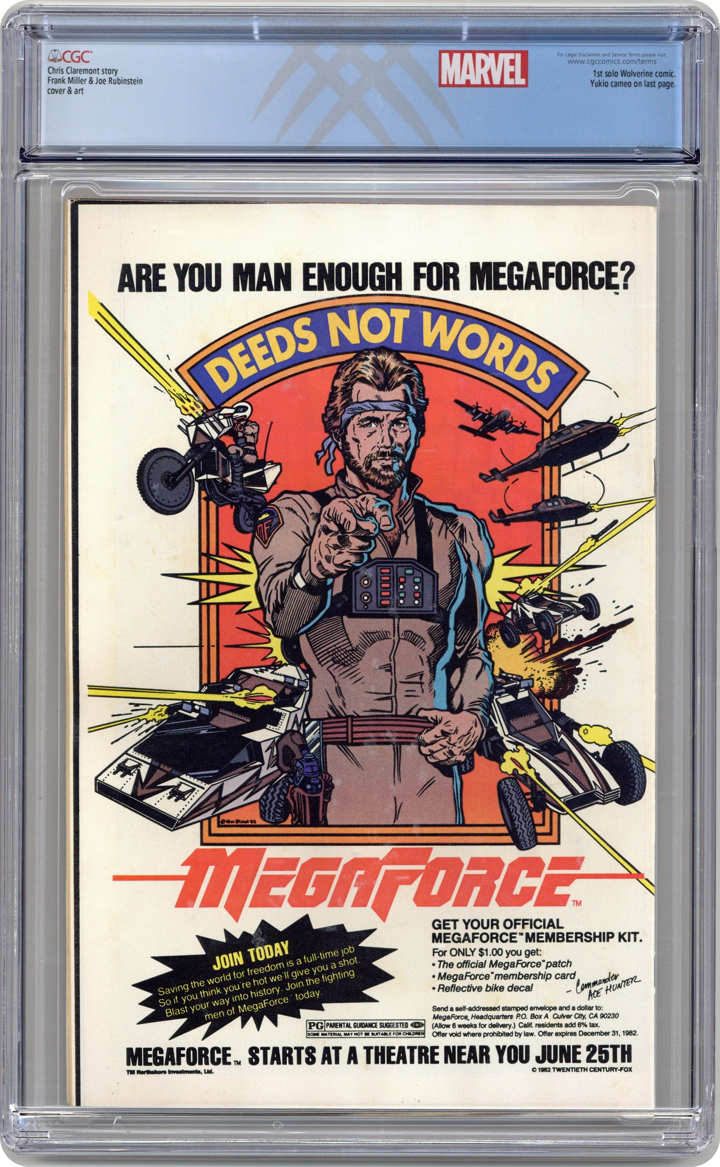 Direct Edition. 1 of 4 Featuring Wolverine in his first solo series fighting in Japan. "Wolverine." Script by Chris Claremont, pencils by Frank Miller, inks by Joe Rubinstein. Miller/Rubinstein cover. Back cover MegaForce ad with art by William Stout. Cover price $0.60. Grade: CGC 8.0 explanation of grade Condition: Used (collectible)