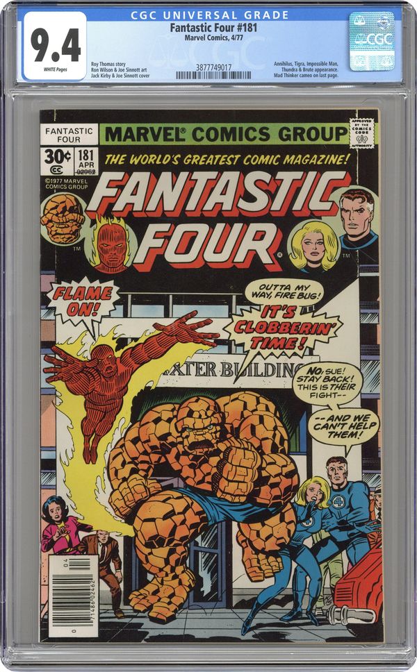 "Side by Side with...Annihilus?" Guest-starring Tigra and Thundra. Written by Roy Thomas. Pencils by Ron Wilson. Inks by Joe Sinnott. Cover by Jack Kirby and Joe Sinnott. After a one-issue hiatus, Reed Richards' odyssey into the Negative Zone continues! When Annihilus appears, Reed prepares for the worst, but the FF's old foe just wants to ask Mr. Fantastic for help. Meanwhile back at the Baxter Building, the Invisible Girl is certain that the Counter-Earth Reed Richards is posing as her husband. So she goes to Alicia's place...just in time to watch Agatha Harkness take off with young Franklin! How many crises can the FF handle? Cameo appearances by the Mad Thinker and Frankie Raye. Note: This issue concludes Roy Thomas' 2-year stint as the writer for the Fantastic Four series. 36 pgs. Cover price $0.30. Grade: CGC 9.4 explanation of grade Condition: Used (collectible)