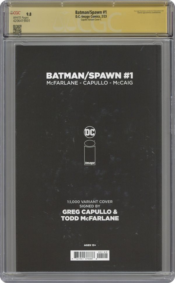 Ended Jul 25 2023 Winning Bid $660 Limited 1 for 1000 Retailer Incentive Variant Cover. Written by Todd McFarlane. Art by Greg Capullo. Cover by Todd McFarlane and Greg Capullo. Two dark heroes, cursed by tragedy, find their paths again crossing...but not by choice! What sinister foe is at work, pitting the Dark Knight against the Hellspawn? From the shadows of Gotham City to New York City, this epic event is the blockbuster you've been waiting almost two decades for! 48 pages, full color. Rated Teen Cover price $6.99. Grade: CGC 9.8 explanation of grade Condition: Used (collectible)