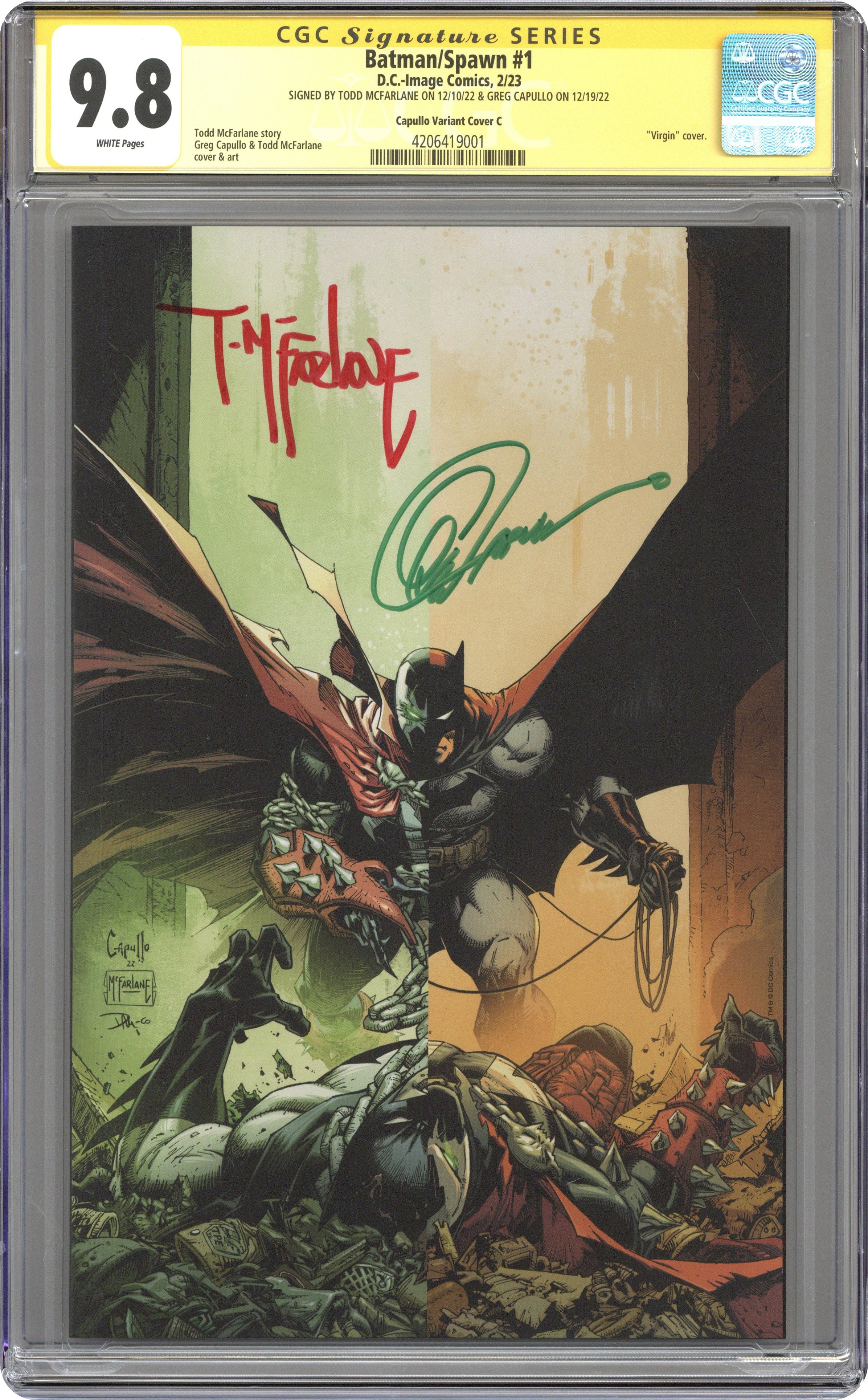 Signed by Todd McFarlane on 12/10/22 & Greg Capullo on 12/19/22. Capullo Variant Cover C. Does not include standard COA (Signature Series).