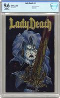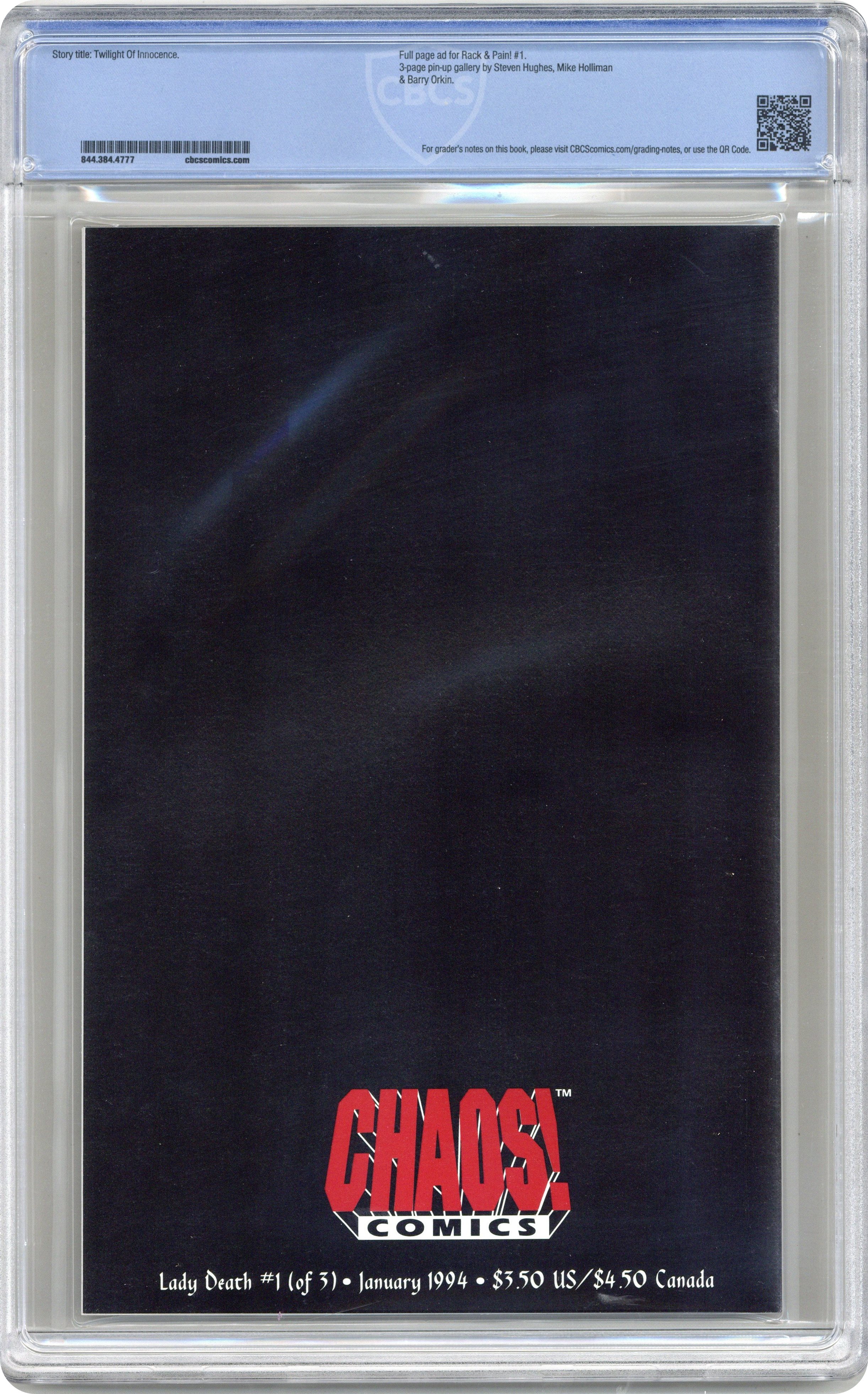 Cover by Steven Hughes. "Twilight of Innocence," script by Brian Pulido, art by Steven Hughes; Lady Death recounts her origins as a young medieval girl whose power mad father tries to gain enough strength to challenge the lord of hell so he can become its ruler. Full page cover art for next issue by Hughes. Lady Death illustrations by Mike Holliman and Barry Orkin. 36 pgs., full color. $3.50. Cover price $3.50. Grade: CBCS 9.6 explanation of grade Condition: Used (collectible)