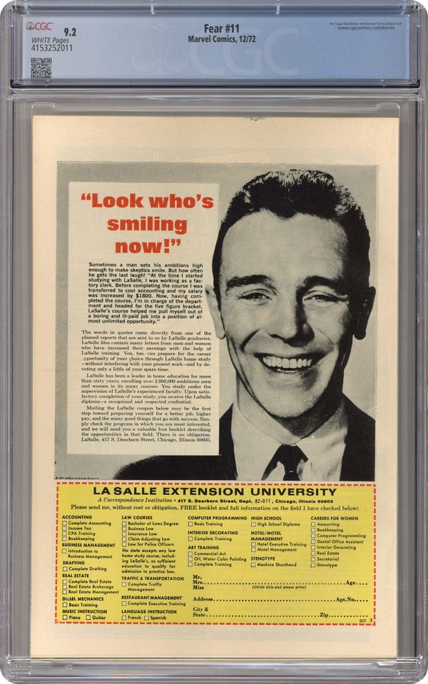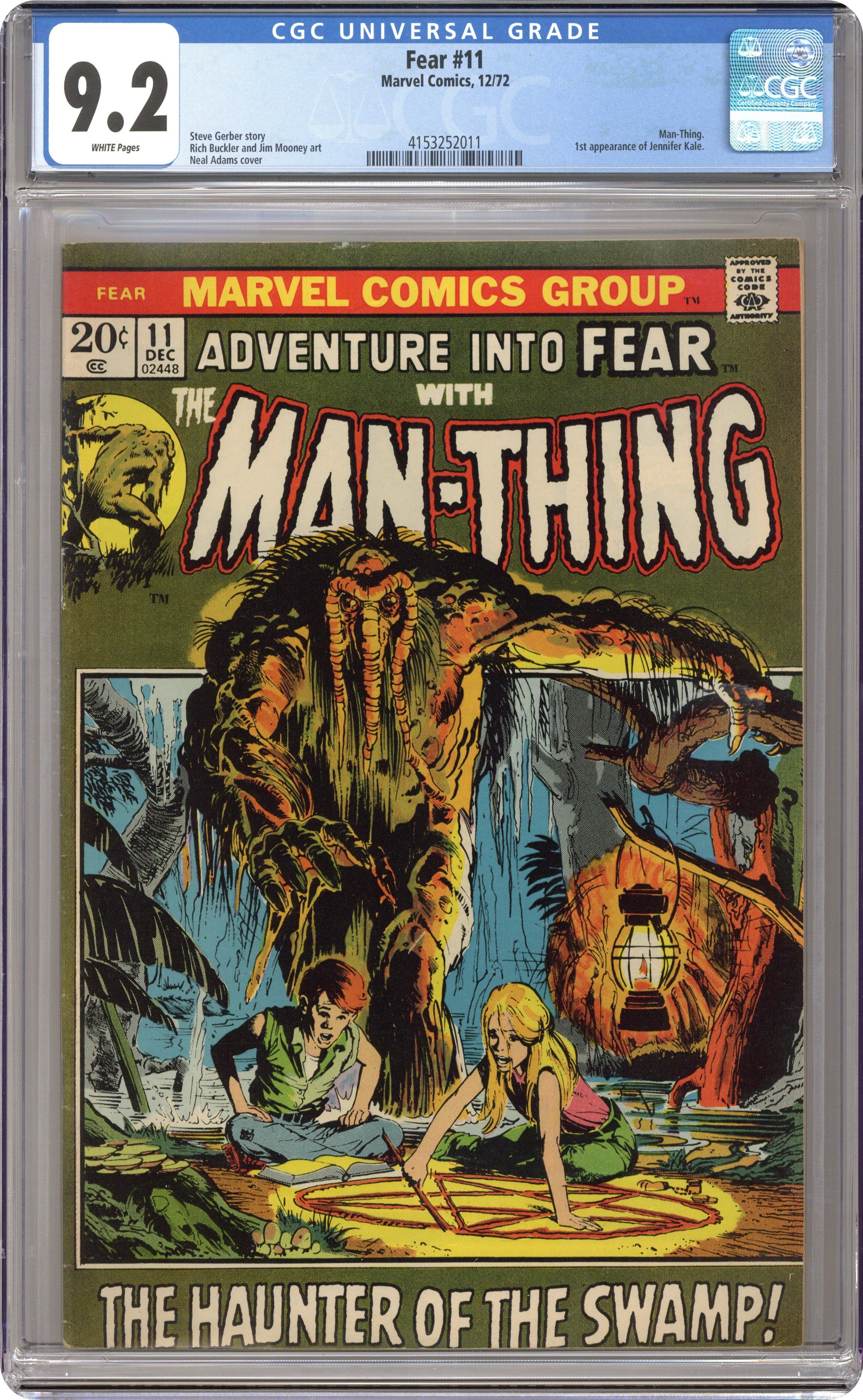 Cover art by Neal Adams. "Night of the Nether-Spawn!", script by Steve Gerber, pencils by Rich Buckler, inks by Jim Mooney; Man-Thing battles Thog the Nether-Spawn, who makes his first appearance; Jennifer Kale also makes her first appearance; Steve Gerber's first full story as a professional writer. "The Spider Waits," art by Fred Kida; Sven's childhood fear of spiders turns to enjoyment as he kills them indiscriminately at his factory cleaning job; He meets a woman who is actually a human spider who lures him into her web, literally. 36 pgs., full color. Cover price $0.20. Grade: CGC 9.2 explanation of grade Condition: Used (collectible)