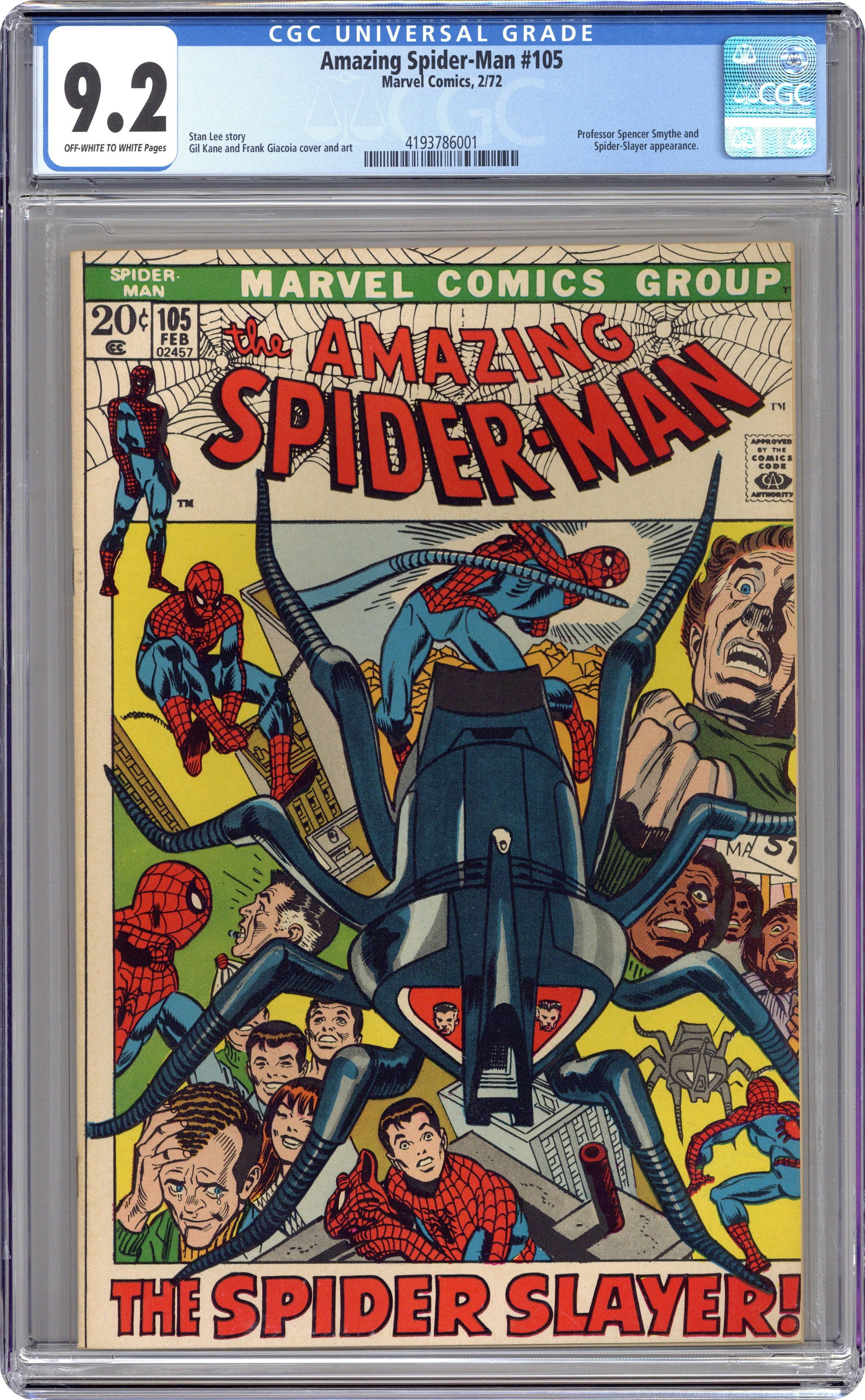 Ended Oct 23 2023 Winning Bid $105 "The Spider Slayer!" Part 1 of 3. Script by Stan Lee. Pencils by Gil Kane. Inks by Frank Giacoia. Cover by Gil Kane and Frank Giacoia. Harry Osborn is out of the hospital after receiving treatment for his drug addiction. And to welcome Harry back to his apartment, Peter and Aunt Maythrow a party for him! Many of Harry's friends attend including Gwen, Mary Jane, and Flash Thompson -- plus Harry's father Norman. Meanwhile, J. Jonah Jameson meets with Spencer Smythe across town. Is Professor Smythe cooking up another spider slayer? Yes he is! And right at dusk the new and improved spider slayer attacks the web-slinger! Will this spider slayer live up to its name? Cameo appearances by Joe Robertson and Randy Robertson. (Notes: This issue is the first appearance of the spider slayer robot (Mark III) -- shaped like an actual spider. Spencer Smythe previously appeared in Amazing Spider-Man #58. This story was reprinted in Marvel Tales #84.) 36 pages. Cover price $0.20. Grade: CGC 9.2 explanation of grade Condition: Used (collectible)