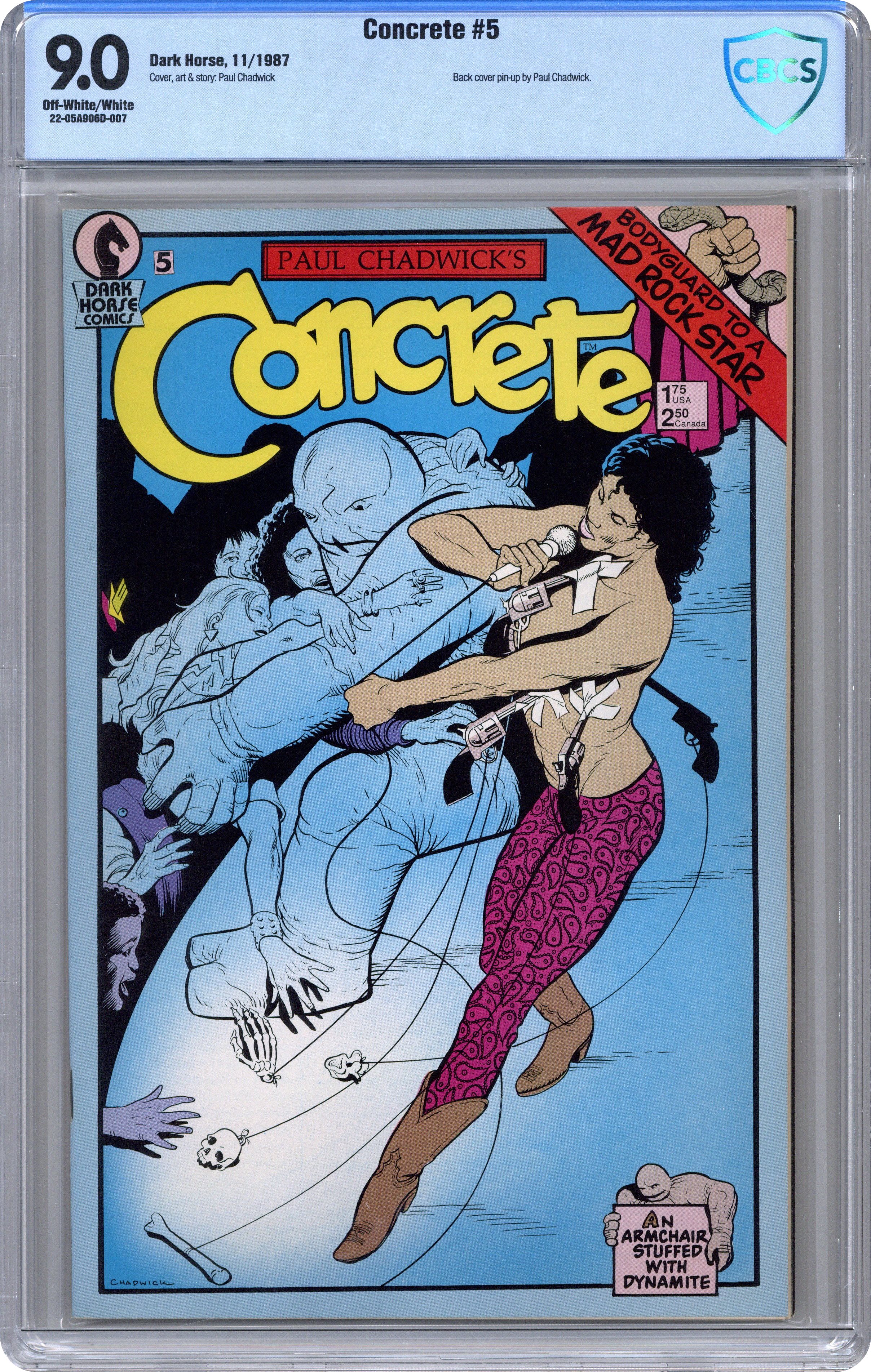 Ended Jun 6 2023 Winning Bid $13 Story and art by Paul Chadwick. Concrete becomes a bodyguard for a death-obsessed rock star. Not even MTV ever gave you anything this wild! "An Armchair Stuffed with Dynamite," by Paul Chadwick. 32 pages, B&W. Cover price $1.75. Grade: CBCS 9.0 explanation of grade Condition: Used (collectible)