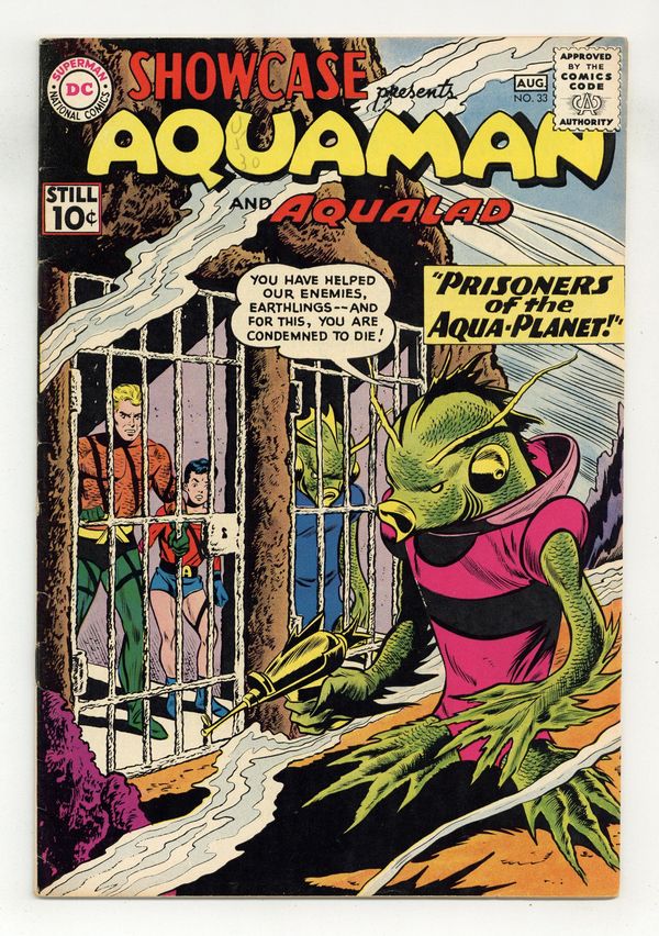 Ended Apr 15 2023 Winning Bid $165 Cover pencils by Dick Dillin, inks by Sheldon Moldoff. Prisoners of the Aqua-Planet starring Aquaman, Aqualad, and Mermor. Aquaman and Aqualad meet Mermor, an alien from Venus who was driven to Earth by the tyrant Naeco. The Alien Creature Ambush; Aquaman and Aqualad are captured along with Mermor and taken to Venus. King of the Land Creatures; Aquaman helps Mermor and his followers in overthrowing the tyrant Naeco. Scripts by Jack Miller, art by Nick Cardy. 36 Pages, Full Color. Cover price $0.10. Grade: FN+ 6.5 explanation of grade Condition: Used (collectible)