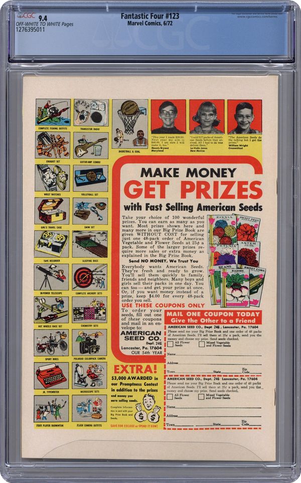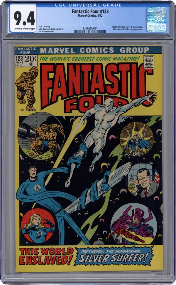 The Silver Surfer and Galactus guest star in "This World Enslaved! " Part 4 of 4 . Script by Stan Lee. Pencils by John Buscema. Inks by Joe Sinnott. Cover by Sal Buscema. With a bold maneuver, Reed Richards turns the tables on the Devourer of Worlds! After sneaking onboard Galactus' starship, Mr. Fantastic threatens to destroy it unless the cosmic Ravager departs from Earth immediately! Will Reed's gallant gamble succeed? Possibly so, but first Mr. Fantastic has to convince the Silver Surfer, Agatha Harkness, General Thunderbolt Ross, and President Richard Nixon to trust him! The FF are going "all in" vs. Galactus! Will it be blackjack or bust? Cameo appearance by Franklin. (Notes: Galactus appears next in Thor 225. The Fantastic Four tangle with Galactus again in FF 172 thru 175. This four-part story was reprinted in Marvel Treasury Edition 21. The letters page includes a letter from comics editor David McDonnell. This issue includes a full-page ad for the first issue of the Hero For Hire series, later renamed Power Man and Iron Fist.) 36 pgs. Cover price $0.20. Grade: CGC 9.4 explanation of grade Condition: Used (collectible)