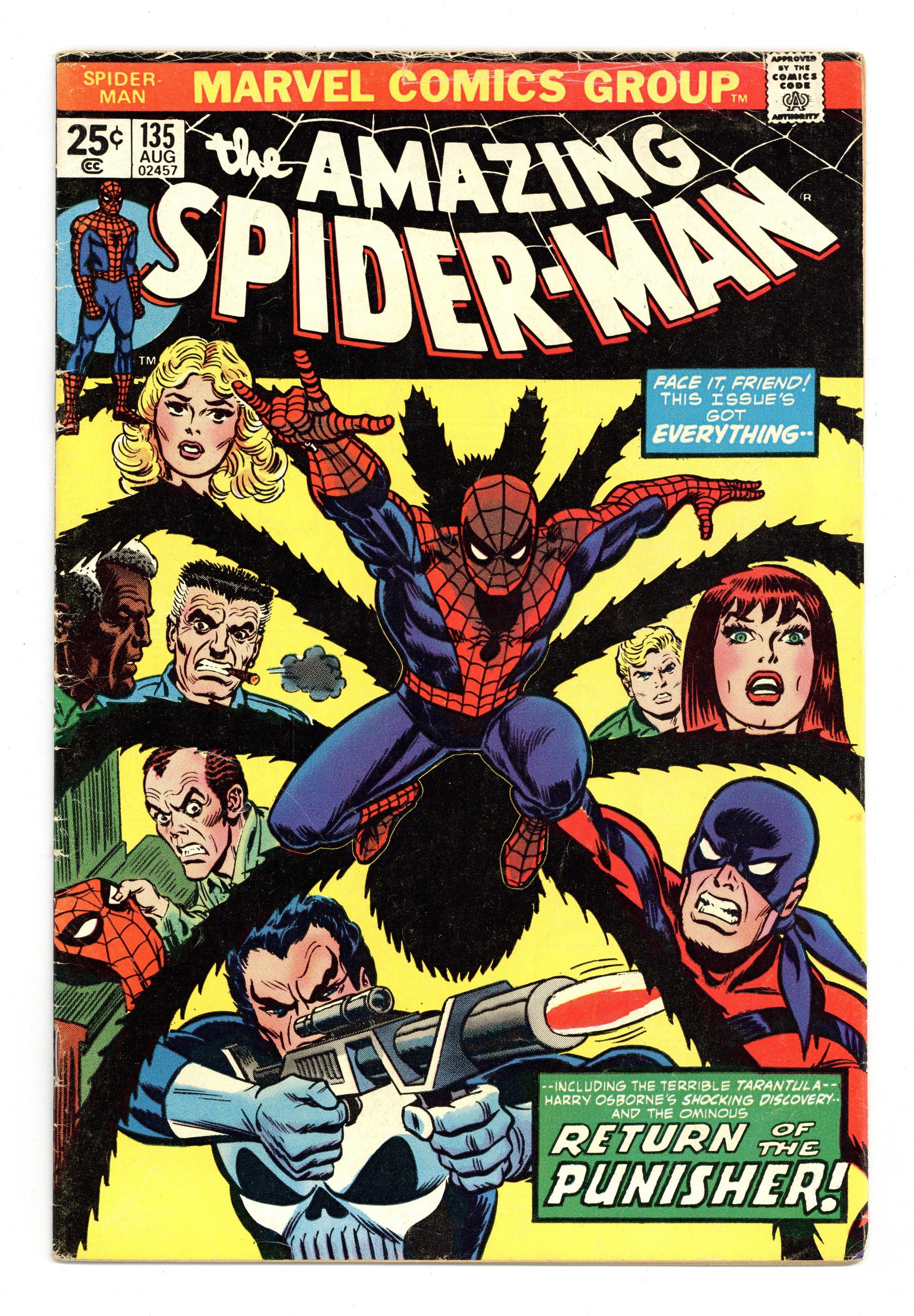 Cover by John Romita Sr. Second full appearance of the Punisher in "Shoot-Out in Central Park," script by Gerry Conway, pencils by Ross Andru, inks by Frank Giacoia; Spider-Man finds himself in a shoot-out with Tarantula and Punisher after saving a cruise ship from hijacking; Peters friends grow suspicious about his double identity; Harry Osborn discovers Peters spider suit! Letter to the editor from Steve Saffel. The letters page also has Marvel Value Stamp series A # 4: Thing (of the Fantastic Four). Reprinted in Marvel Tales # 112 and 211. 36 pgs., full color. $0.25. Cover price $0.25. Grade: VG- 3.5 explanation of grade Condition: Used (collectible)