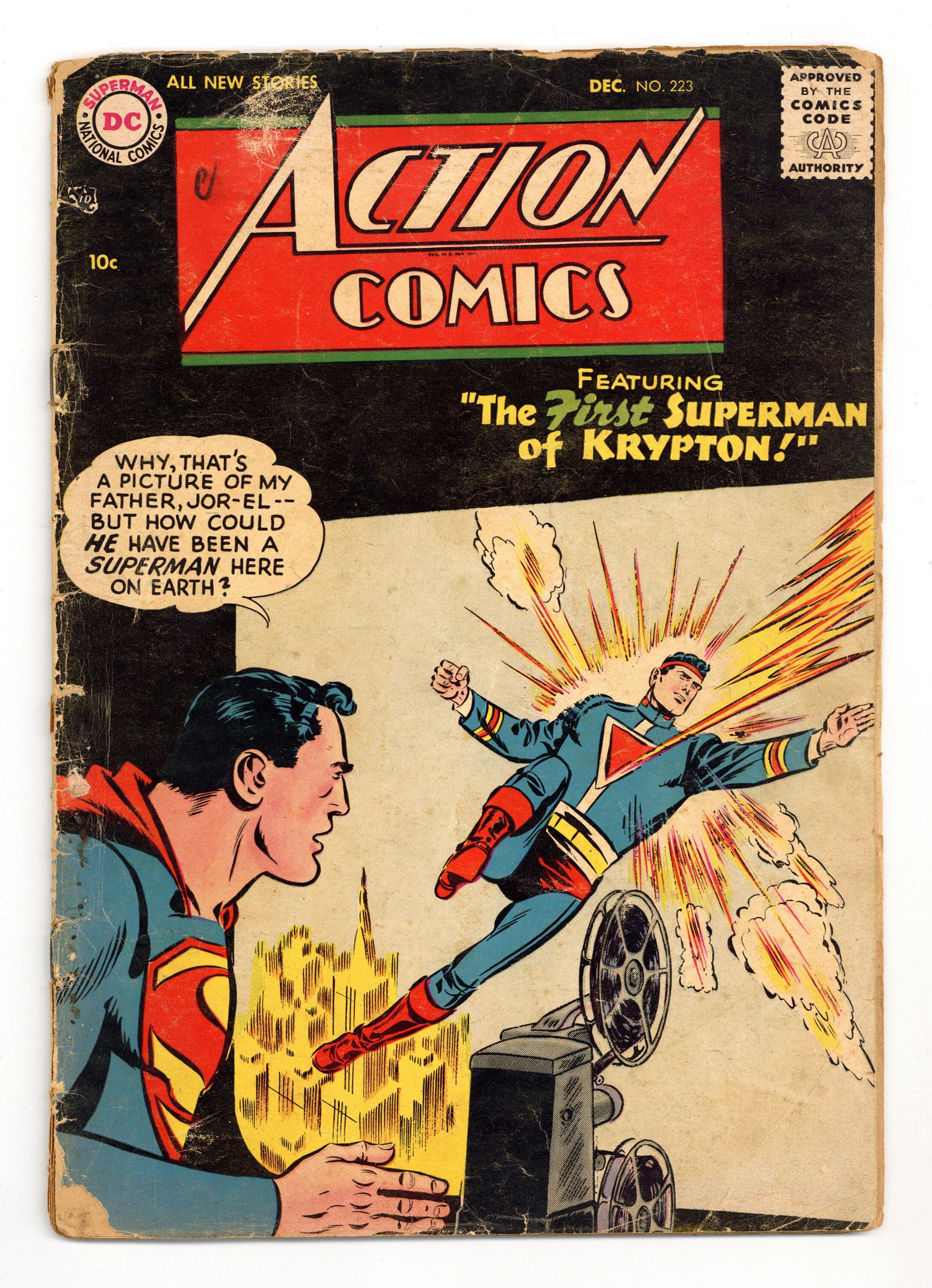 Cover pencils by Wayne Boring, inks by Stan Kaye. "The First Superman of Krypton," script by Edmond Hamilton, pencils by Wayne Boring, inks by Stan Kaye; Superman discovers a lead box in space containing another journal of Jor-Els and some films which he made; When he reads the journal and views the films, he learns how Jor-El first discovered evidence of Kryptons coming destruction shortly before Kal-Els birth on the 10,000th year of Kryptons civilization; Superman realizes his father was the first "superman" of Krypton, and silently promises to use his powers only in the cause of righteousness. "Janu, Jungle God" starring Congo Bill, script by Jack Miller, art by Howard Sherman. "How To Start A Stamp Collection" article by Jack Miller (as Joe Mallon), art by Raymond Perry. "The Amazing Future Toys," script by Otto Binder, art by Jim Mooney; Tommy Tomorrow vs. Nova Norton. 36 Pages, Full Color. $.10 Cover price $0.10. Grade: PR 0.5 explanation of grade Condition: Used (collectible)