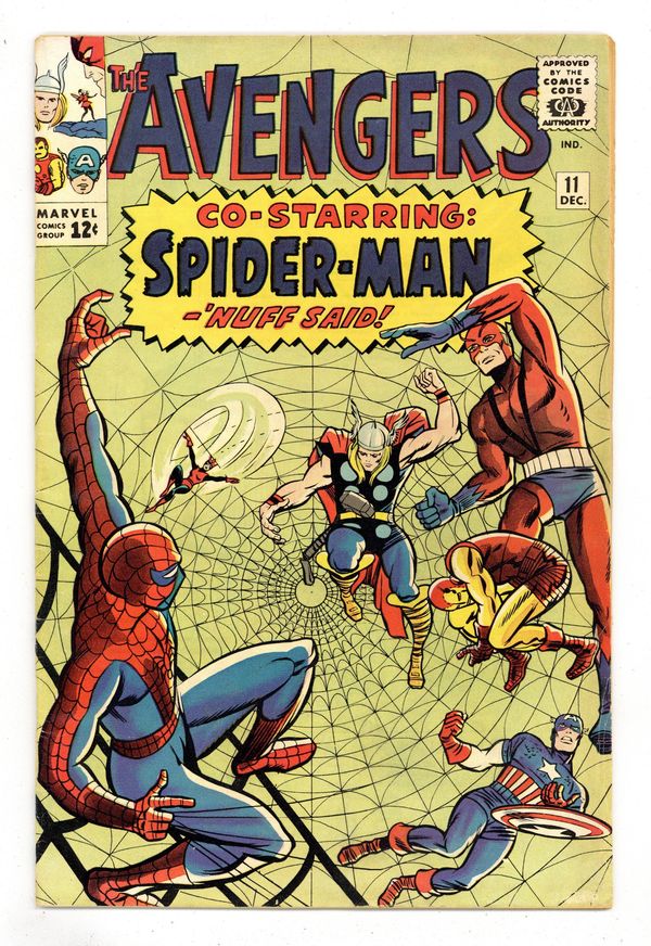 Ended Jul 12 2023 Winning Bid $146 Cover pencils by Jack Kirby, inks by Chic Stone. The Mighty Avengers Meet Spider-Man, script by Stan Lee, pencils by Don Heck, inks by Chic Stone; Kang creates a robotic Spider-Man and sends him back in time to battle the Avengers. Roster: Captain America, Thor, Giant-Man, Wasp, and Rick Jones. Guest stars the Amazing Spider-Man. Villain: Kang. Cameo appearances by Zemo, the Executioner, Wonder Man, Dr. Doom, Magneto, Mysterio, the Unicorn, and Kraven the Hunter (all in Kang's files). Kang pin-up. 36 pgs. Cover price $0.12. Grade: VG- 3.5 explanation of grade Condition: Used (collectible)