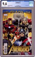 Cover by JOHN ROMITA JR. Written by BRIAN MICHAEL BENDIS Pencils by JOHN ROMITA JR. THE HEROIC AGE IS HERE! There came a day! A day unlike any other...where two of Marvel's top creators teamed up for the very first time to create a bombastic new monthly Marvel comic that not only ushers in the Heroic Age of Marvel Comics but unleashes onto the world the most blockbuster Avengers team ever! Who will answer the call? And will they assemble just in time...because Kang the Conqueror is here from the future. And wait till you find out why...! Bonus back up feature: the oral history of the Avengers, part one. A brand new illustrated look at the Avengers in a way you have never seen before by series writer Brian Michael Bendis. Cover price $3.99. Grade: CGC 9.6 explanation of grade Condition: Used (collectible)