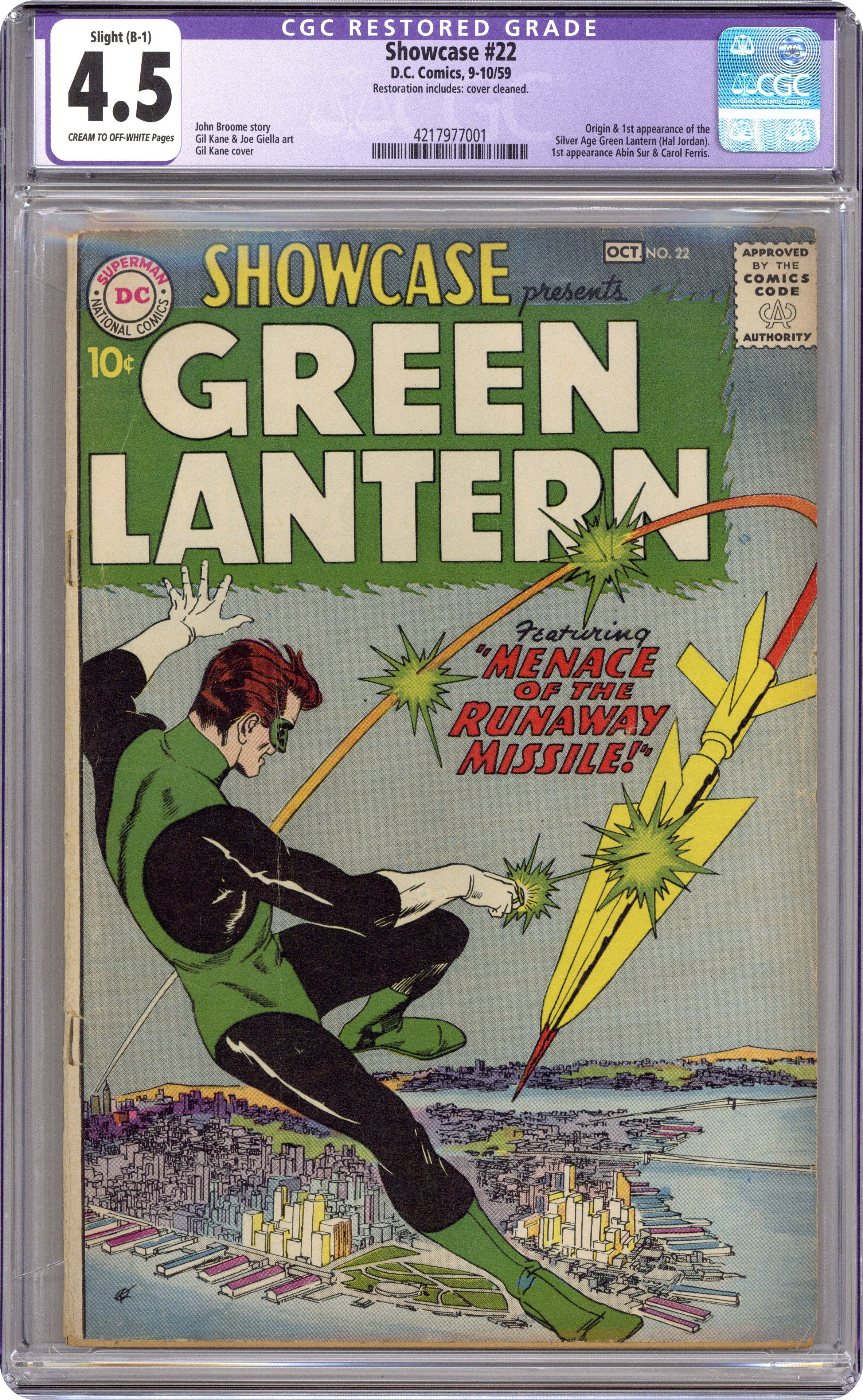 Ended Jul 19 2023 Winning Bid $2,751 Origin and 1st appearance of Hal Jordan (Silver Age Green Lantern). Cover and interior art by Gil Kane. SOS Green Lantern; Hal Jordan is selected by the power ring of Abin Sur to become a Green Lantern. Secret of the Flaming Spear!; Saboteurs try to crash a new experimental aircraft created by Ferris Aircraft. Menace of the Runaway Missile!; Green Lantern stops a missile launched by Dr. Parris at a government Hydrogen Power facility. Scripts by John Broome. 36 Pages, Full Color. Cover price $0.10. Grade: CGC 4.5 explanation of grade Condition: Used (collectible)