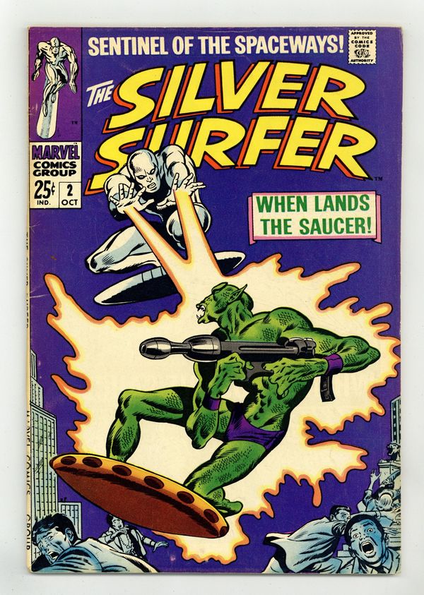 "When Lands the Saucer!" Written by Stan Lee. Art and cover by John Buscema and Joe Sinnott. Exiled to planet Earth by his former master, Galactus, the Silver Surfer, a being empowered with the Power Cosmic itself, finds he cannot penetrate the invisible barrier which the Devourer of Worlds has encompassed the planet with. However, this barrier does not prevent others from beyond the stars from coming to Earth and wrecking havoc. Thus, when a malevolent race of aliens descend upon the unsuspecting citizens of Earth, only the Silver Surfer possesses the power to stop them. Includes the Watcher back-up "The Coming of the Krills!" Story by Stan Lee. Art by Gene Colan and Paul Reinman. 68 pages Cover price $0.25. Grade: VG/FN 5.0 explanation of grade Condition: Used (collectible)