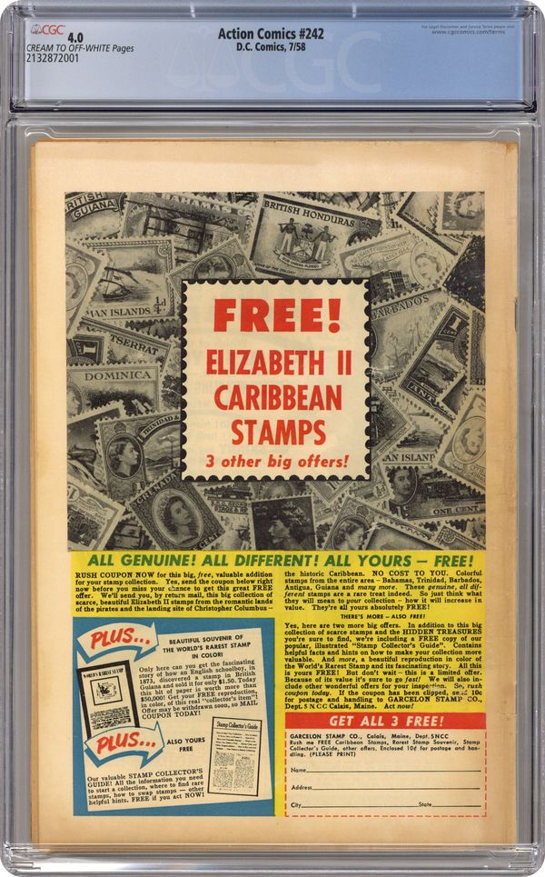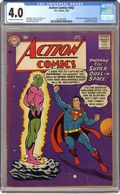 Cover pencils by Curt Swan, inks by Stan Kaye. Origin and first appearance of Brainiac, and the first mention of the shrunken city of Kandor in "The Super-Duel in Space," script by Otto Binder, art by Al Plastino; While on an experimental rocket, Clark and Lois encounter the alien Brainiac, who plans to shrink and bottle the great cities of Earth and then use them to repopulate his planet; Superman gets inside Brainiacs ship when the villain snatches Metropolis and there finds a bottle with the Kryptonian city of Kandor. Untitled Little Pete story by Henry Boltinoff. "The Traffic Cop of 2058, A.D." starring Tommy Tomorrow, script by Otto Binder, art by Jim Mooney. "Safari From Space," art by Howard Sherman; Congo Bill vs. Xov. 36 Pages, Full Color. $.10 Cover price $0.10. Grade: CGC 4.0 explanation of grade Condition: Used (collectible)