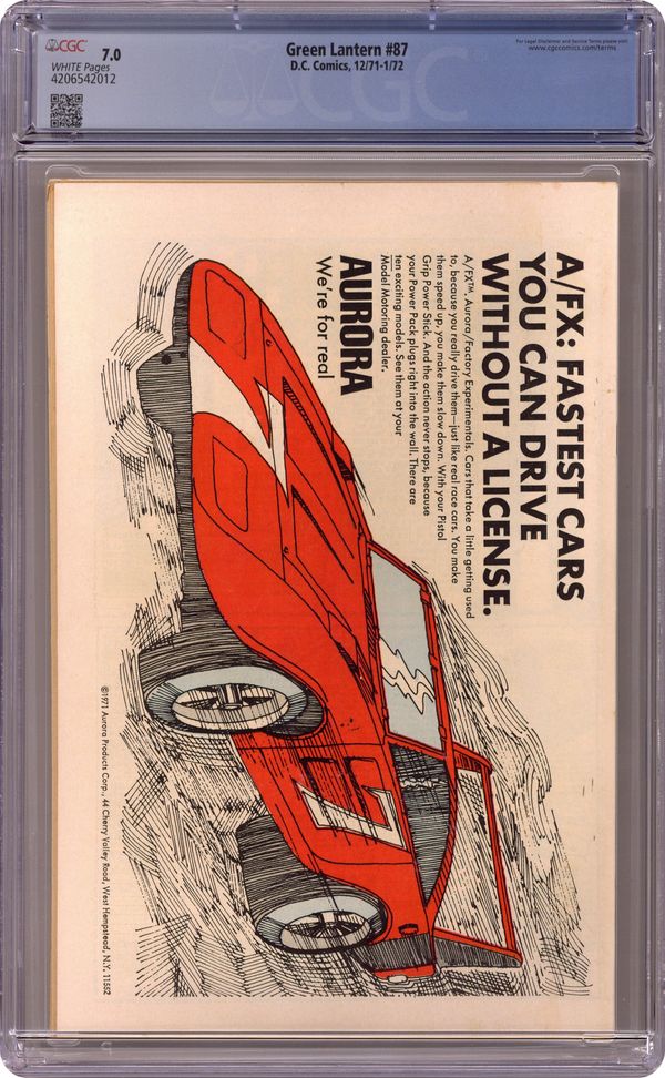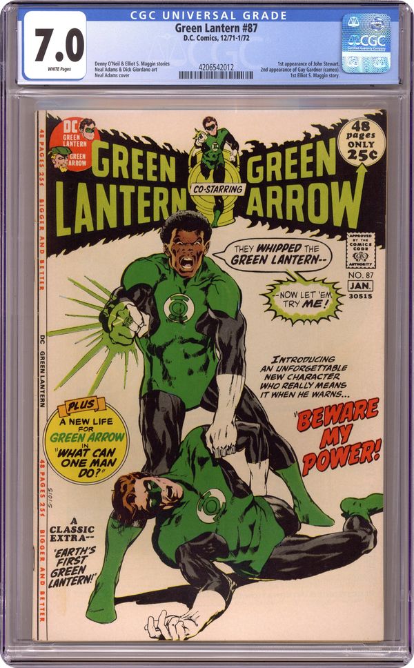 Giant-size issue. Cover by Neal Adams. First appearance of John Stewart in Beware My Power, script by Denny O'Neil, pencils by Neal Adams, inks by Dick Giordano; When Guy Gardner is injured, the Guardians of the Universe instruct Hal Jordan to train another back-up, but John Stewart has different ideas about how to be a Lantern; When an attempt is seemingly made on the life of racist politician Jeremiah Clutcher, John Stewart figures out that the attack was faked and part of a cynical plot to get Clutcher elected president. What Can One Man Do?, script by Elliot Maggin, pencils by Neal Adams, inks by Dick Giordano; After Green Arrow witnesses the death of a young boy in a riot, he decides that he might be able to do more for his city as its mayor. Reprint back-up story: Earth's First Green Lantern!, (from Green Lantern 16), script by Gardner Fox, pencils by Gil Kane, inks by Murphy Anderson; Hal Jordan explains to Pieface why Abin Sur came to Earth in a spaceship when all Green Lanterns can travel thru space unaided. The Flash ad. 52 pgs., full color. $0.25. Cover price $0.25. Grade: CGC 7.0 explanation of grade Condition: Used (collectible)
