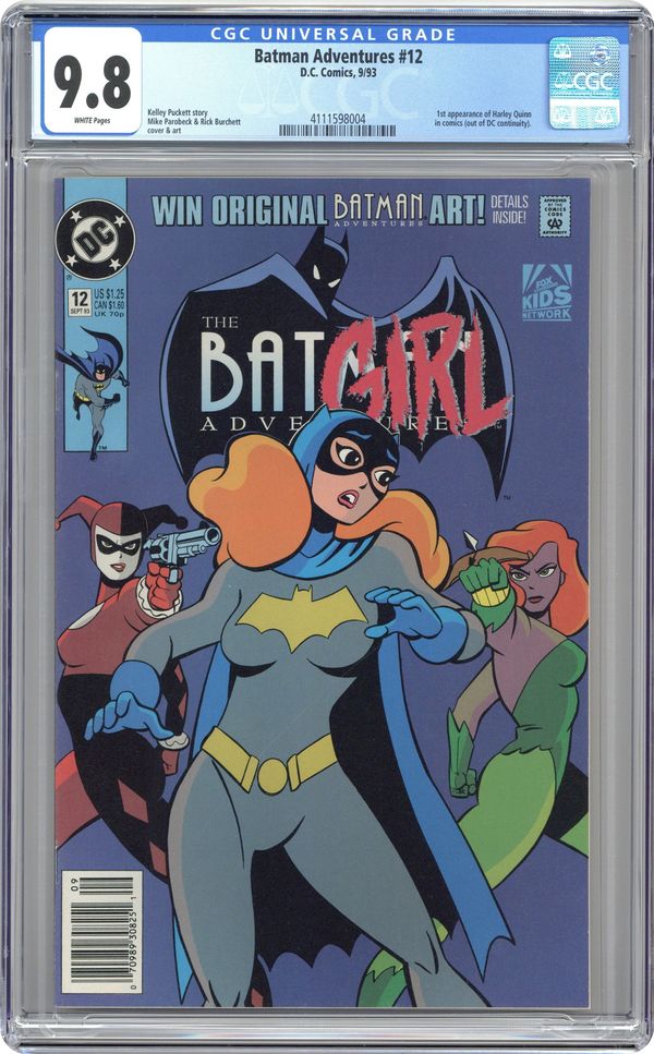 Direct Edition. 1st appearance of Harley Quinn in a comic book. "Batgirl: Day One." Barbara Gordon attends a costume party dressed as Batgirl. Unfortunately, Poison Ivy and Harley Quinn also decide to show up. Based on Batman The Animated Series. Script by Kelley Puckett, pencils by Mike Parobeck, inks by Rick Burchett. Cover by Parobeck. Cover price $1.25. Grade: CGC 9.8 explanation of grade Condition: Used (collectible)