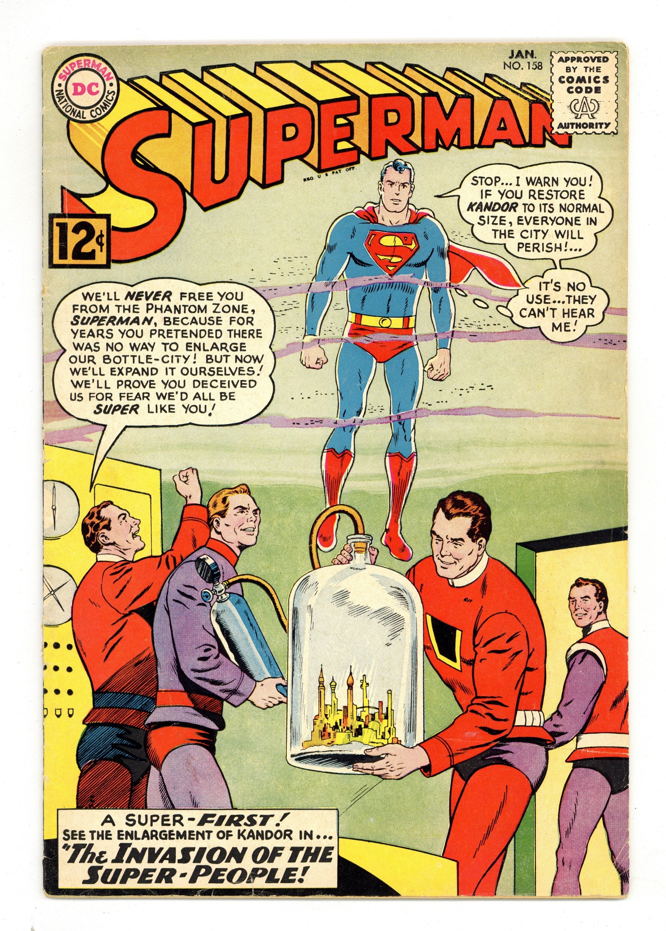 Cover pencils by Curt Swan, inks by George Klein. First appearance of Flamebird and Nightwing in a full-length story: Invasion of the Mystery Super-Men! [Superman in Kandor part 1], script by Edmond Hamilton, pencils by Curt Swan, inks by George Klein; Superman and Jimmy Olsen travel to Kandor to discover how normal sized Kandorians are on Earth and why they are attacking Superman. The Dynamic Duo of Kandor! [Superman in Kandor part 2]; Superman and Jimmy Olsen take the secret identites of Nightwing and Flamebird so they can track down Than-Ol's raiders and stop his scheme to enlarge Kandor. The City of Super-People! [Superman in Kandor part 3]. 36 Pages, Full Color. Cover price $0.12. Grade: GD/VG 3.0 explanation of grade Condition: Used (collectible)