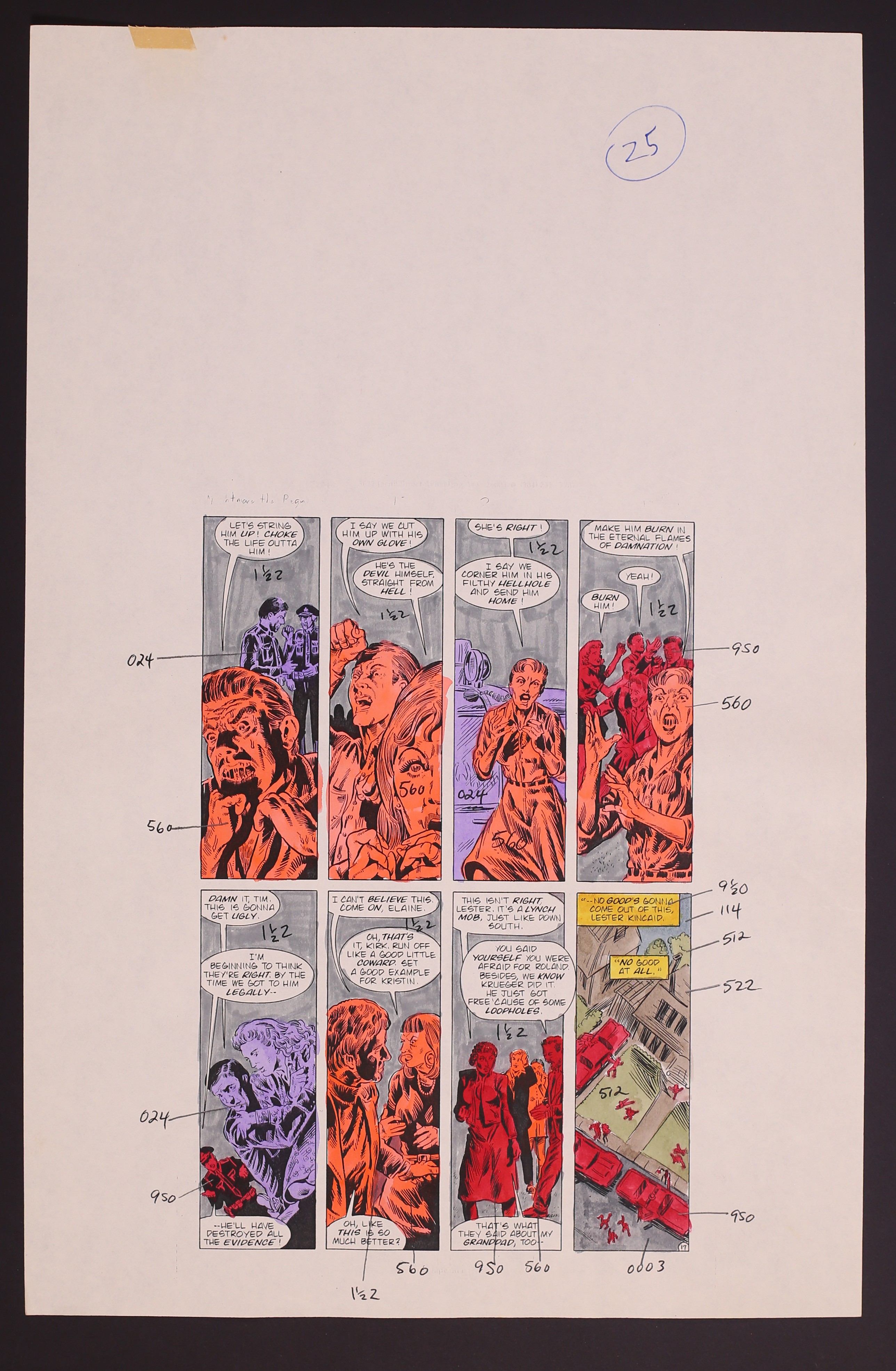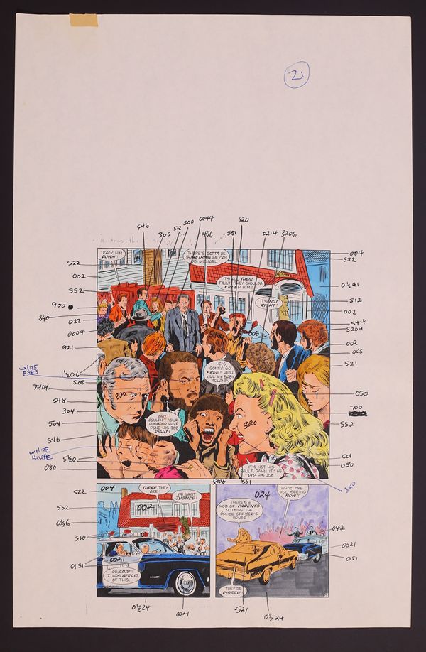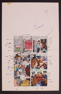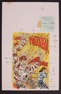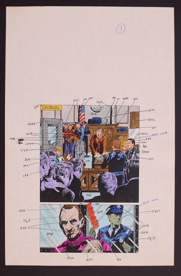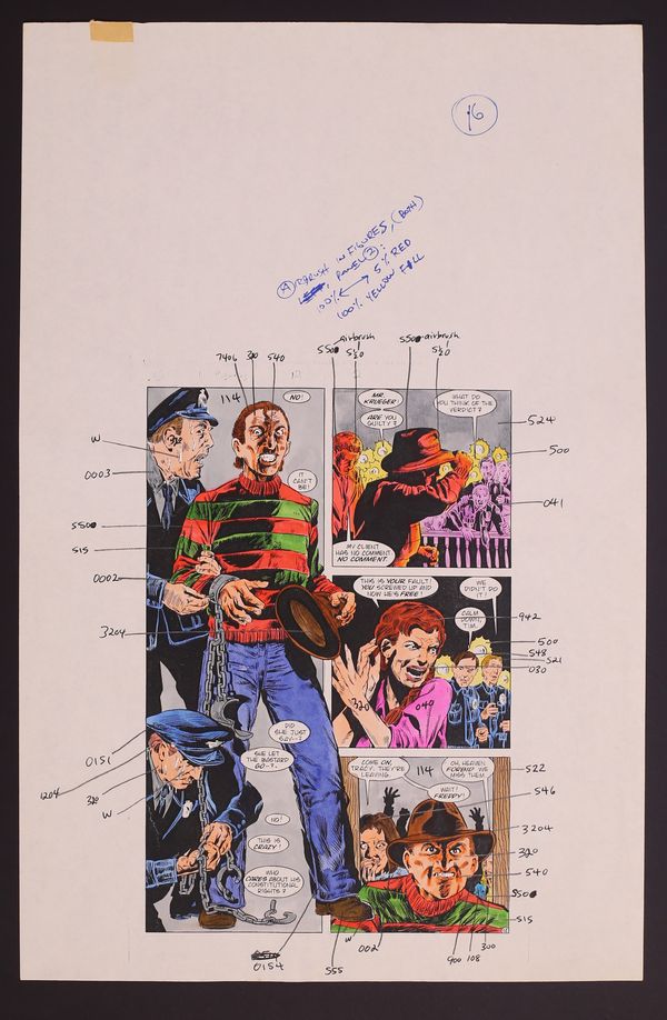 Colors are credited in the issue to "Mal T. Cullers" which is likely not a real person. This 24 page set of hand-painted colors over printed linework encompasses the entirety of the issue. The pages are marked up with production and editorial notes making this a one-of-a-kind look at the making of the origin of a horror icon. Watercolor over printed linework on paper. Each of the 24 pages measures 11" x 24". Note: The page numbers noted on the pages are the "lineup" pages meaning they take into account ad pages. All story pages are present.