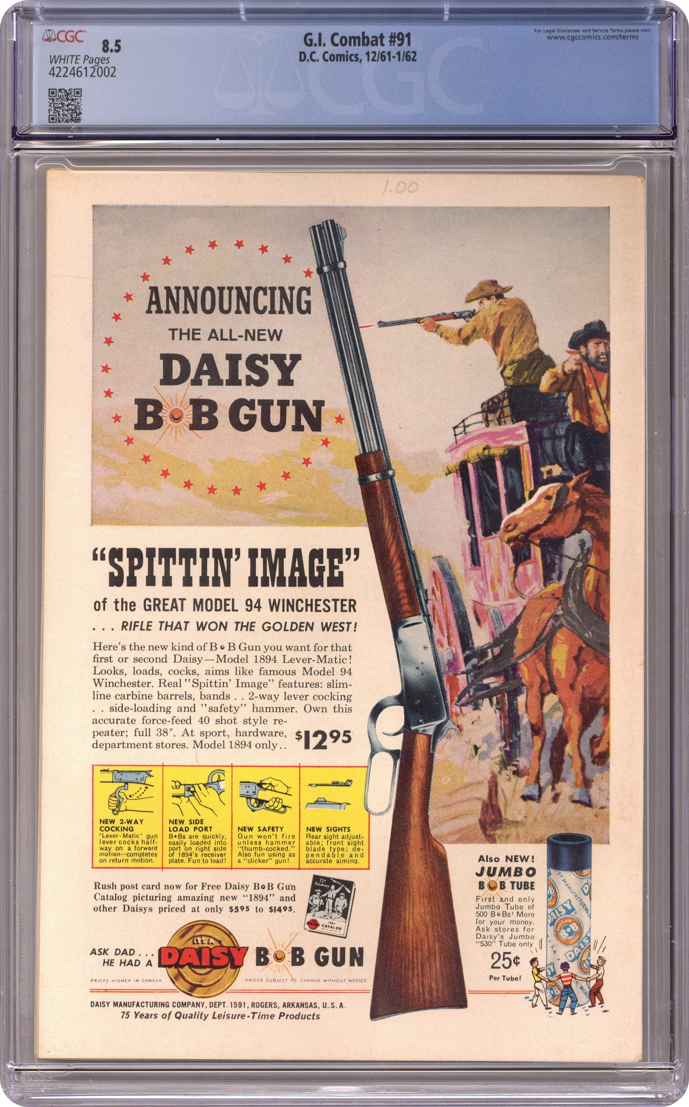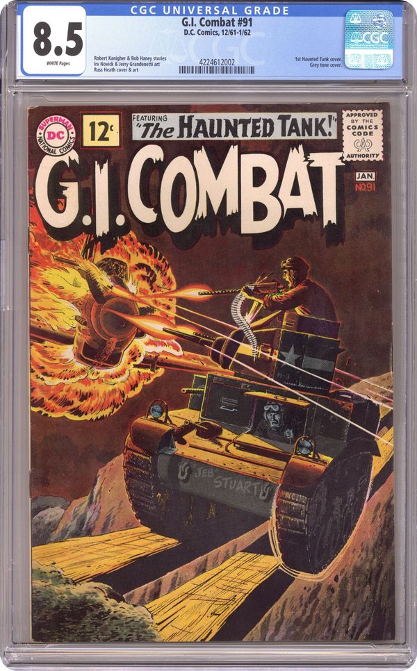 Ended Jul 29 2023 Winning Bid $2,426 First 12c cover-priced issue. Cover by Russ Heath and Jack Adler (washtone). Written by Robert Kanigher and Bob Haney. Art by Russ Heath, Irv Novick and Jerry Grandenetti. The Haunted Tank crew helps a turtle and are in return helped by the turtle in "The Tank and the Turtle!" by Robert Kanigher and Russ Heath. Starring the Haunted Tank, Jeb Stuart, Arch Asher, Rick Rawlins, Slim Stryker and General J.E.B. Stuart (ghost). Plus: "Wings for a Wash-Out!" by Bob Haney and Irv Novick; "Secret War for a Snowbird!" by Haney and Jerry Grandenetti; and 1-pager "Marine Air Squadrons." 36 Pages, Full Color. Cover price $0.12. Grade: CGC 8.5 explanation of grade Condition: Used (collectible)
