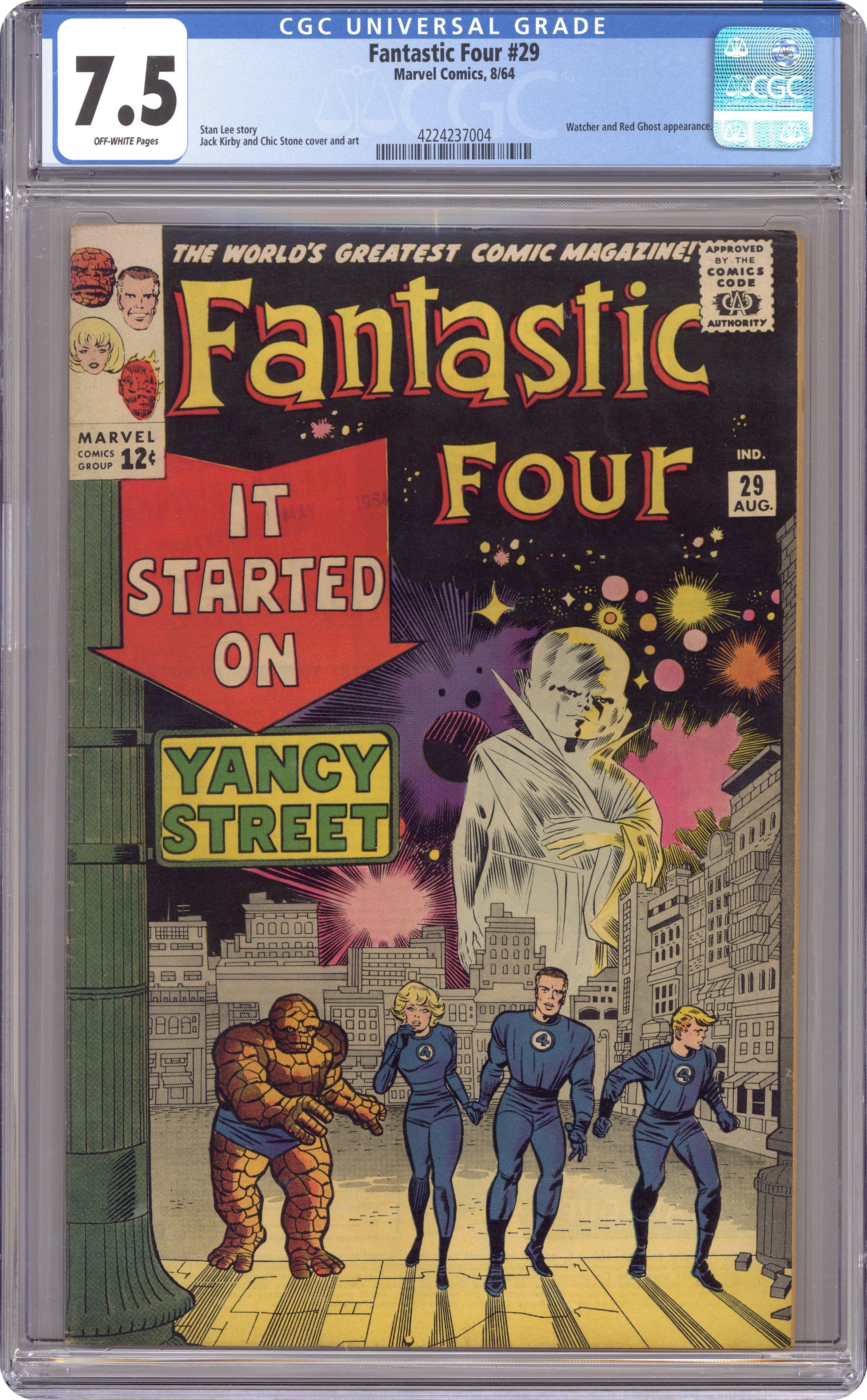 Ended Jan 17 2024 Winning Bid $277 Cover pencils by Jack Kirby, inks by Chic Stone. It Started on Yancy Street!, script by Stan Lee, pencils by Jack Kirby, inks by Chic Stone; the FF run from the jeers and pranks of the Yancy Street Gang; the FF battles the Red Ghost; the Super Apes take off in FFs ship, leaving them abandoned; the Watcher returns them home. Cameos by the Puppet Master, the Mole Man, the Super-Skrull, the Miracle Man, Doctor Doom, the Sub-Mariner, and the Mad Thinker. 36 pgs. $0.12. Cover price $0.12. Grade: CGC 7.5 explanation of grade Condition: Used (collectible)