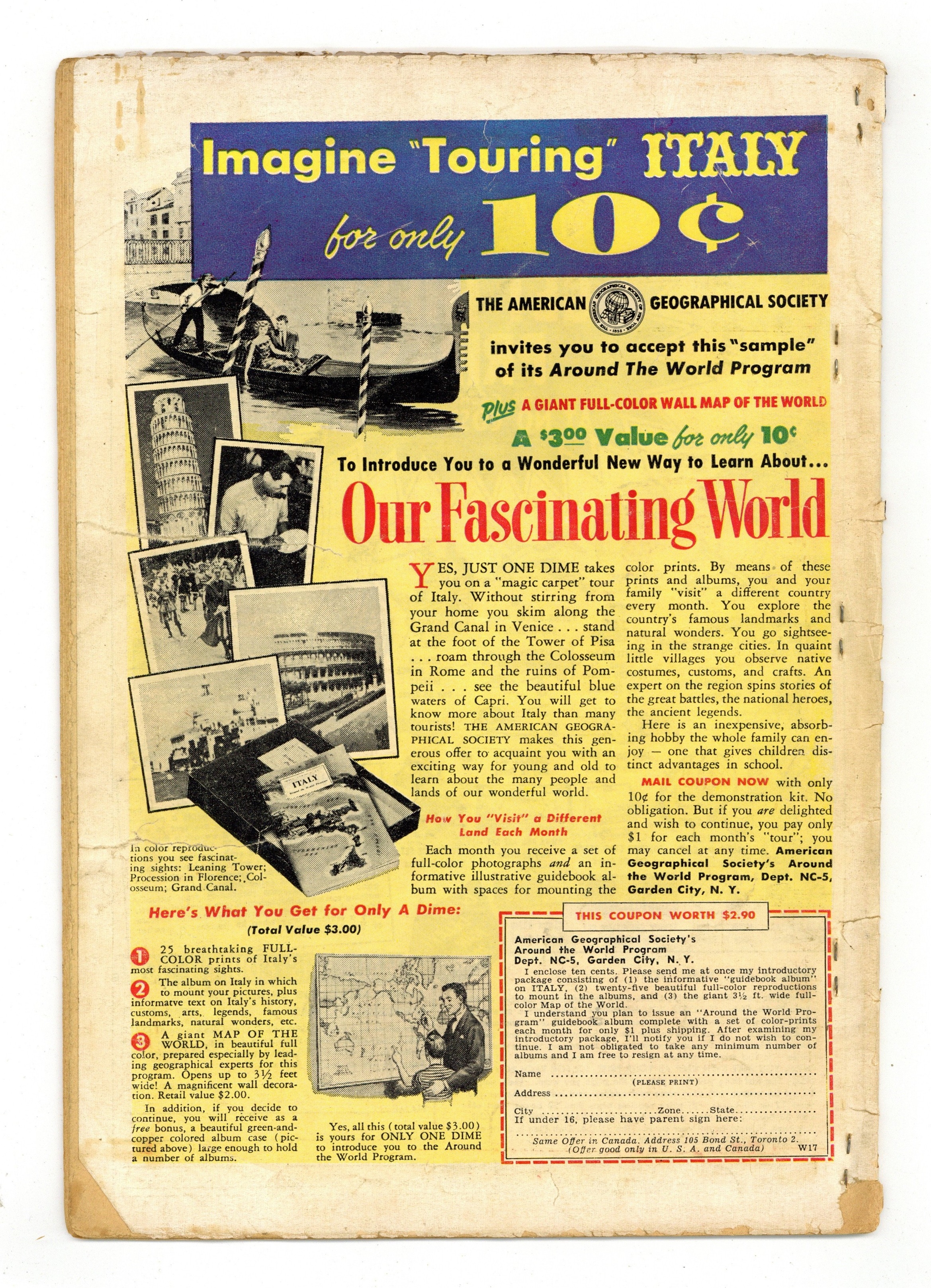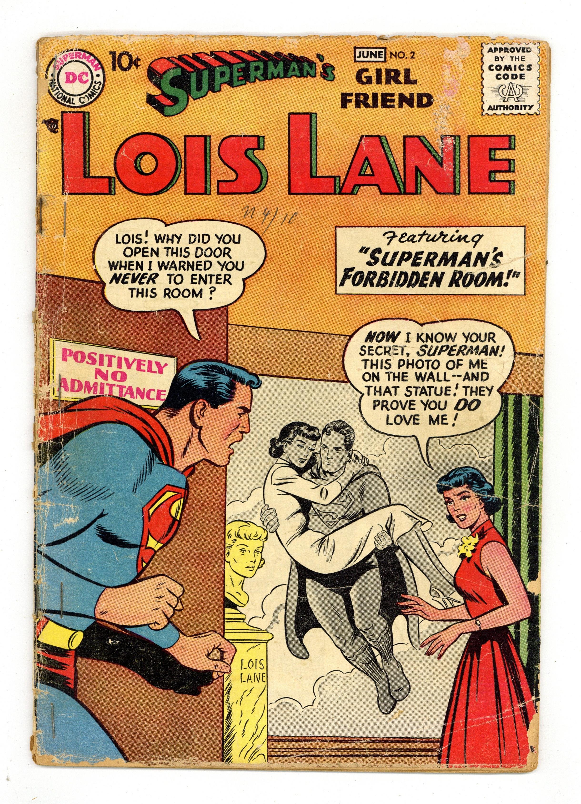 Cover pencils by Curt Swan, inks by Stan Kaye. Superman's Secret Sweetheart, art by Kurt Schaffenberger; Lois tries to help a lonely college girl gain acceptance with her classmates by setting her up as Superman's girl friend, and gets Superman to go along with the ruse. Cora the Car Hop teen story by Henry Boltinoff. Lois Lane in Hollywood, script by Otto Binder, art by Kurt Schaffenberger. Director Zorne is making a movie about Superman, and Superman, Jimmy, and Perry all play their own parts, but Lois is replaced by Gilda Glamarr; A series of accidents make everyone believe that Lois is trying to spoil the movie shoot because she is jealous. That Deep Dark Secret! public service announcement starring Buzzy, script by Jack Schiff, art by Win Mortimer; Margie learns that having a mental patient in the family is nothing to be ashamed of. Superman's Forbidden Room, script by Jerry Coleman, pencils by Wayne Boring, inks by Stan Kaye; Rackets Williams and Dan Jones try to trick Lois into thinking that Dan is really Superman. Jerry the Jitterbug story by Henry Boltinoff. 36 Pages, Full Color. Cover price $0.10. Grade: GD- 1.8 explanation of grade Condition: Used (collectible)