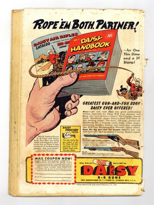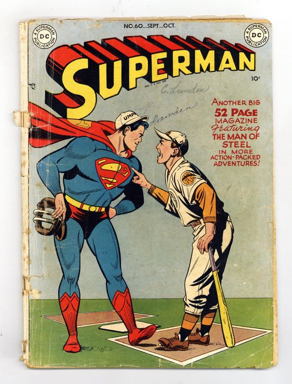 Cover art by Al Plastino. The Two Identities of Superman, pencils by Wayne Boring, inks by Stan Kaye; Superman tries to convince Hollis Shore that he's really Perry White. The Men Who Had to Guard Superman, script by Bill Finger, pencils by Wayne Boring, inks by Stan Kaye; When a dying scientist tells Clark a secret formula, the Secret Service decides they must protect him. Smokey, the Fire-Preventing Bear Comes to the Rescue of Peter Porkchops public service announcement, script by Jack Schiff, art by Otto Feuer. Casey the Cop humor two-pager by Henry Boltinoff. Birth of the Leathernecks, an origin of the U.S. Marines. Superman Fights the Super-Brain, pencils by Wayne Boring, inks by Stan Kaye; The Toyman builds a super computer to plot crimes for him. Stan Musial Wheaties full-page ad. 52 Pages, Full Color. Cover price $0.10. Grade: GD- 1.8 explanation of grade Condition: Used (collectible)