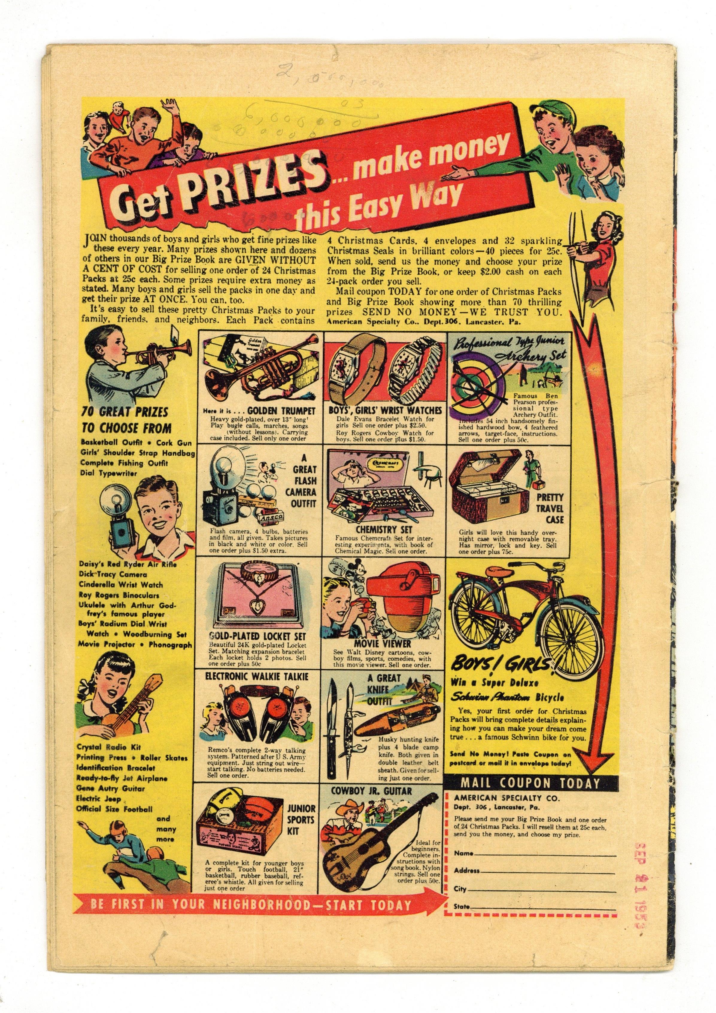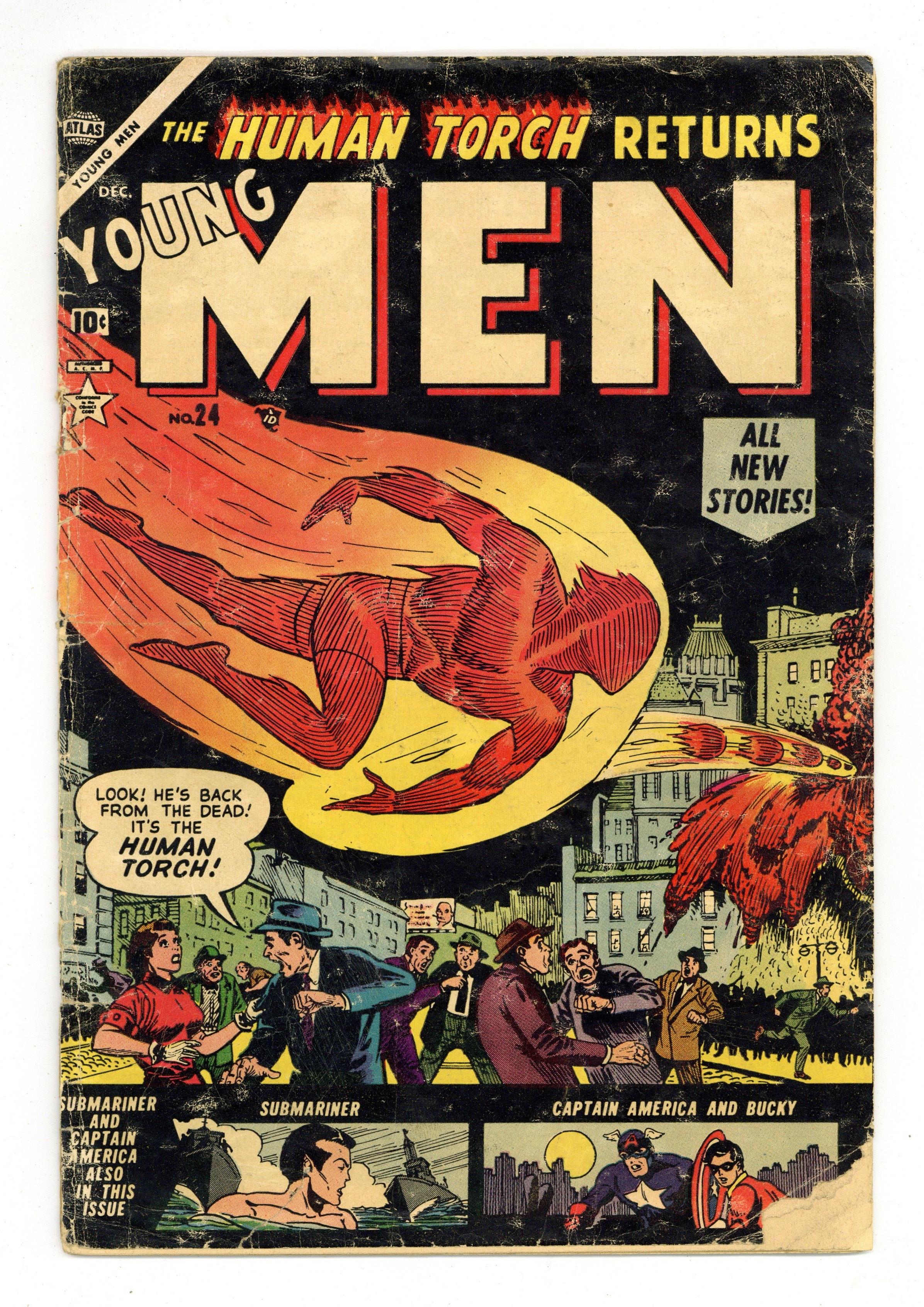 Cover by Carl Burgos. Written by Hank Chapman, Don Rico and unknown. Art by Russ Heath, Carl Burgos, John Romita, Sr., Mort Lawrence and Bill Everett. In this issue: The Human Torch (Jim Hammond) and Toro (Thomas Raymond) in "The Return of...the Human Torch" by Hank Chapman, Russ Heath and Carl Burgos (art for Torch figure on splash page); Captain America, Bucky and the Red Skull in "Back From the Dead!" by Don Rico, John Romita, Sr. and Mort Lawrence (art for first panel of splash page); the Sub-Mariner returns in a story with art by Bill Everett; and "A Traitor Among Us" text story. 36 pages, full color. Cover price $0.10. Grade: GD- 1.8 explanation of grade Condition: Used (collectible)