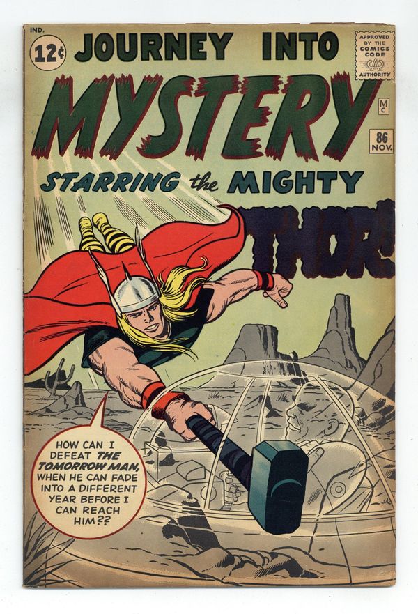 Cover pencils by Jack Kirby, inks by Dick Ayers. First full appearance of Odin and the Tomorrow Man in "On the Trail of the Tomorrow Man!", script by Stan Lee (plot) and Larry Lieber (script), pencils by Jack Kirby, inks by Dick Ayers; Zarrko of the year 2262 goes back in time and steals a cobalt bomb in 1962, but Thor chases him forward in time and defeats him; Jane Foster (Nelson) cameo. "Weather Man" two-page text story, art by Joe Maneely. "Humans, Keep Out!", script by Stan Lee, art by Don Heck; Humans are distressed to discover that the Venusians believe them to be hostile and have built robots to destroy any expedition that lands. "The Changeling!", script by Stan Lee, art by Steve Ditko; An ugly king threatens a sorcerer with death unless he makes the king "the most handsome male" so the sorcerer turns him into a swan. 36 pages, full color. Cover price $0.12. Grade: GD+ 2.5 explanation of grade Condition: Used (collectible)
