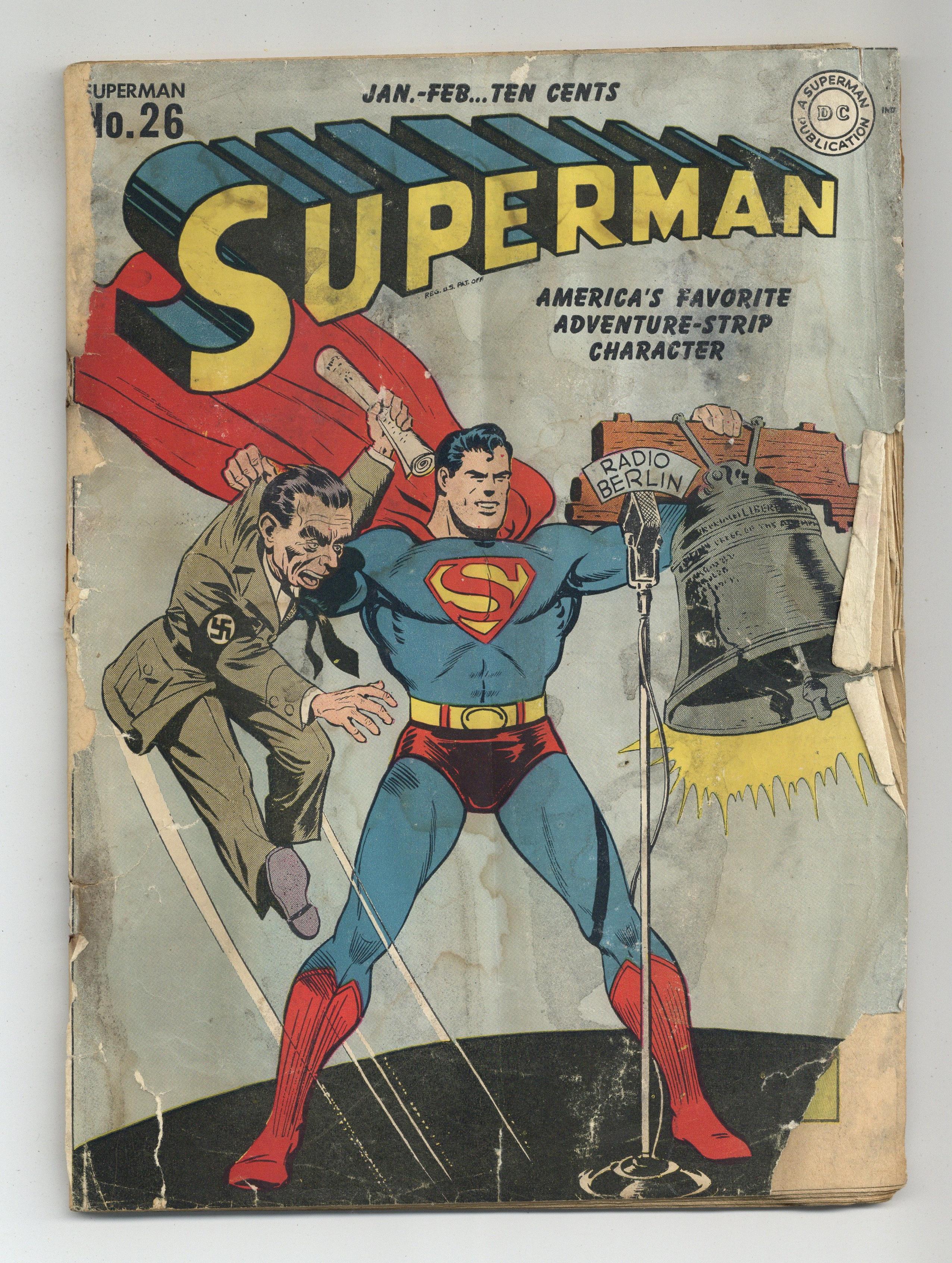 Classic war cover. Cover pencils by Wayne Boring, inks by George Roussos. The Super Stunt-Man!, script by Bill Finger [as Jerry Siegel], pencils by Joe Shuster and Ira Yarbrough [as Joe Shuster]; The son of a former carnival daredevil comes to town, not knowing his father had lost his nerve years before in a car stunt gone wrong. Comedians' Holiday!, script by Don Cameron [as Jerry Siegel], art by Ira Yarbrough [as Joe Shuster]; Clark and Lois decry the closing of a new movie company that has given work to former vaudeville comedians. Private Pete humor page by Henry Boltinoff. Superman's Master!, script by Jerry Siegel, pencils by Ira Yarbrough [as Joe Shuster]. The March text story by Alton Black. Good Ol Judge Jalopy humor page by Jack Farr. The Quicksilver Kid! starring Superman, script by Don Cameron [as Jerry Siegel], pencils by Dick Sprang (layouts) and San Citron (finishes) [as Joe Shuster]. 60 Pages, Full Color. Cover price $0.10. Grade: PR 0.5 explanation of grade Condition: Used (collectible)