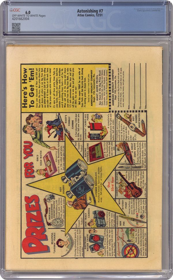 Published Nov 1951 by Marvel/Atlas.Astonishing (1951 Marvel/Atlas) 7 CGC 6.0
