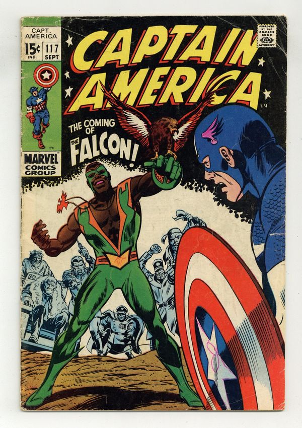 Ended Oct 17 2023 Winning Bid $76 Cover pencils by Gene Colan and John Romita (alterations), inks by Joe Sinnott and John Romita (alterations). First appearance and origin of the Falcon in "The Coming of... the Falcon!", script by Stan Lee, pencils by Gene Colan, inks by Joe Sinnott; With the Red Skull previously having switched bodies with Captain America, the Skull uses the Cosmic Cube to send Cap to the tropical island home of the Exiles; There Cap encounters a falconer from Harlem who had been hired by the Exiles but who is now attempting to help the island natives kick the Exiles from their home; Cap joins forces with the falconer who, with Cap's urging, dons a costume and takes the name the Falcon. Letter to the editor from writer James Van Hise. 36 pgs., full color. $0.15. Cover price $0.15. Grade: GD+ 2.5 explanation of grade Condition: Used (collectible)