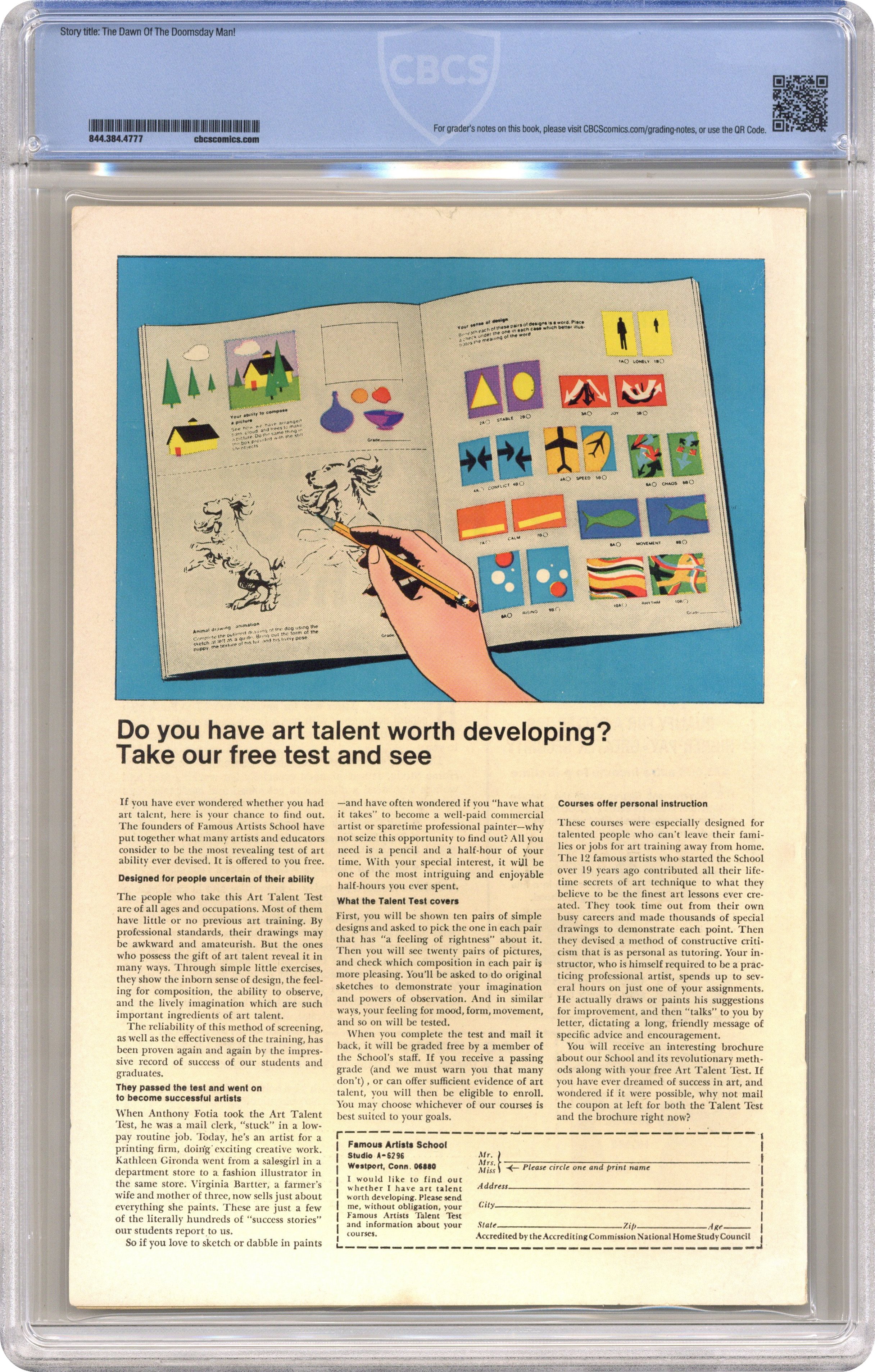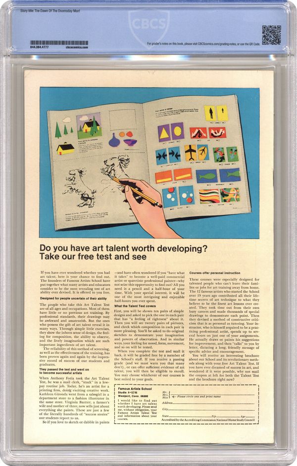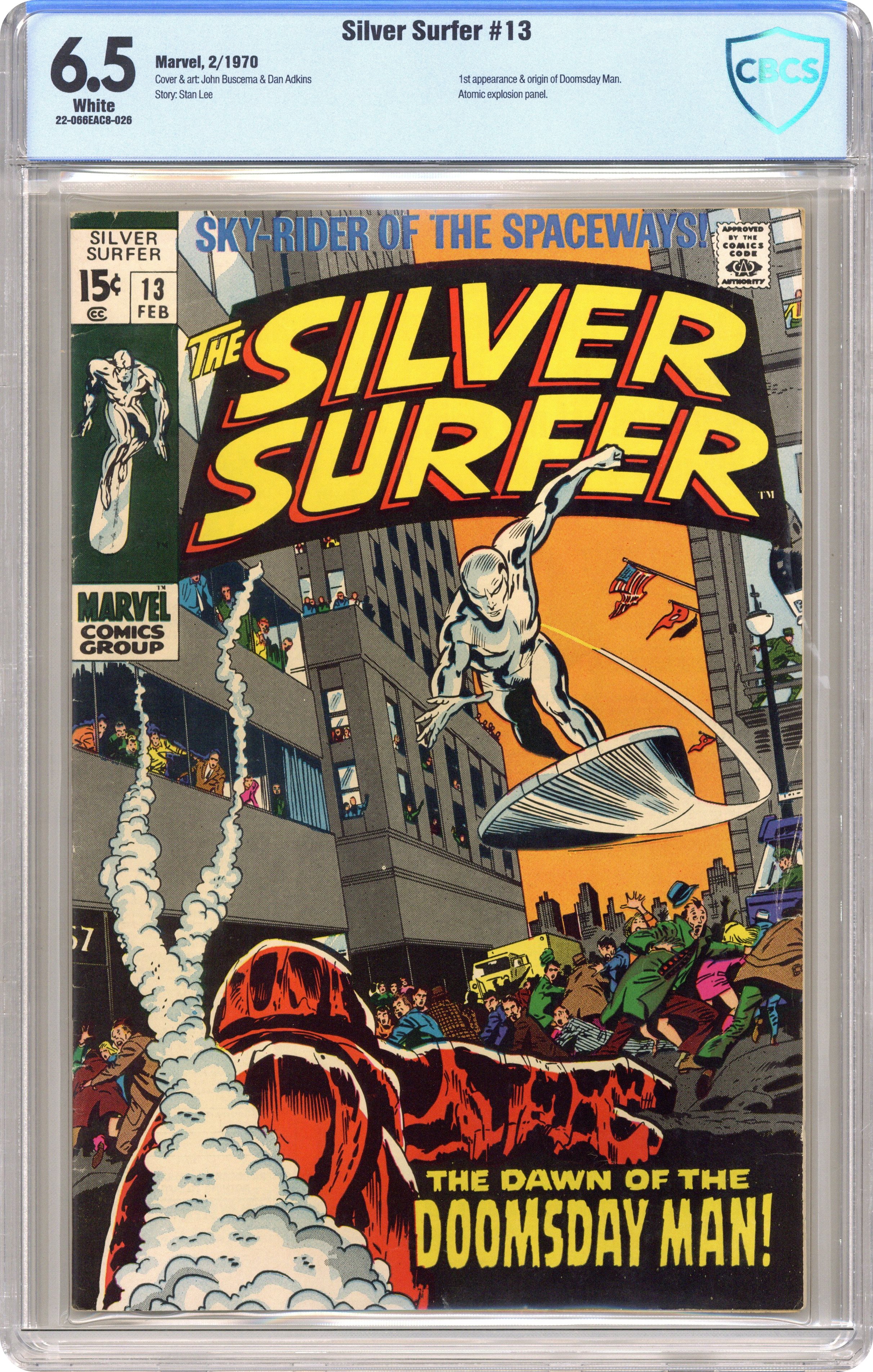 Ended Jul 2 2024 Winning Bid $56 "The Dawn of the Doomsday Man!" Written by Stan Lee. Art by John Buscema and Dan Adkins. The ground rumbles and the citizens of New York City tremble in fear as the monstrosity known as the Doomsday Man rise from the bowels of the earth. Only the Silver Surfer, a being whom the people of Earth have ridiculed and alienated time and again, can save them now. Cover price $0.15. Grade: CBCS 6.5 explanation of grade Condition: Used (collectible)