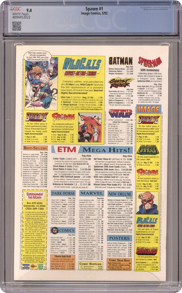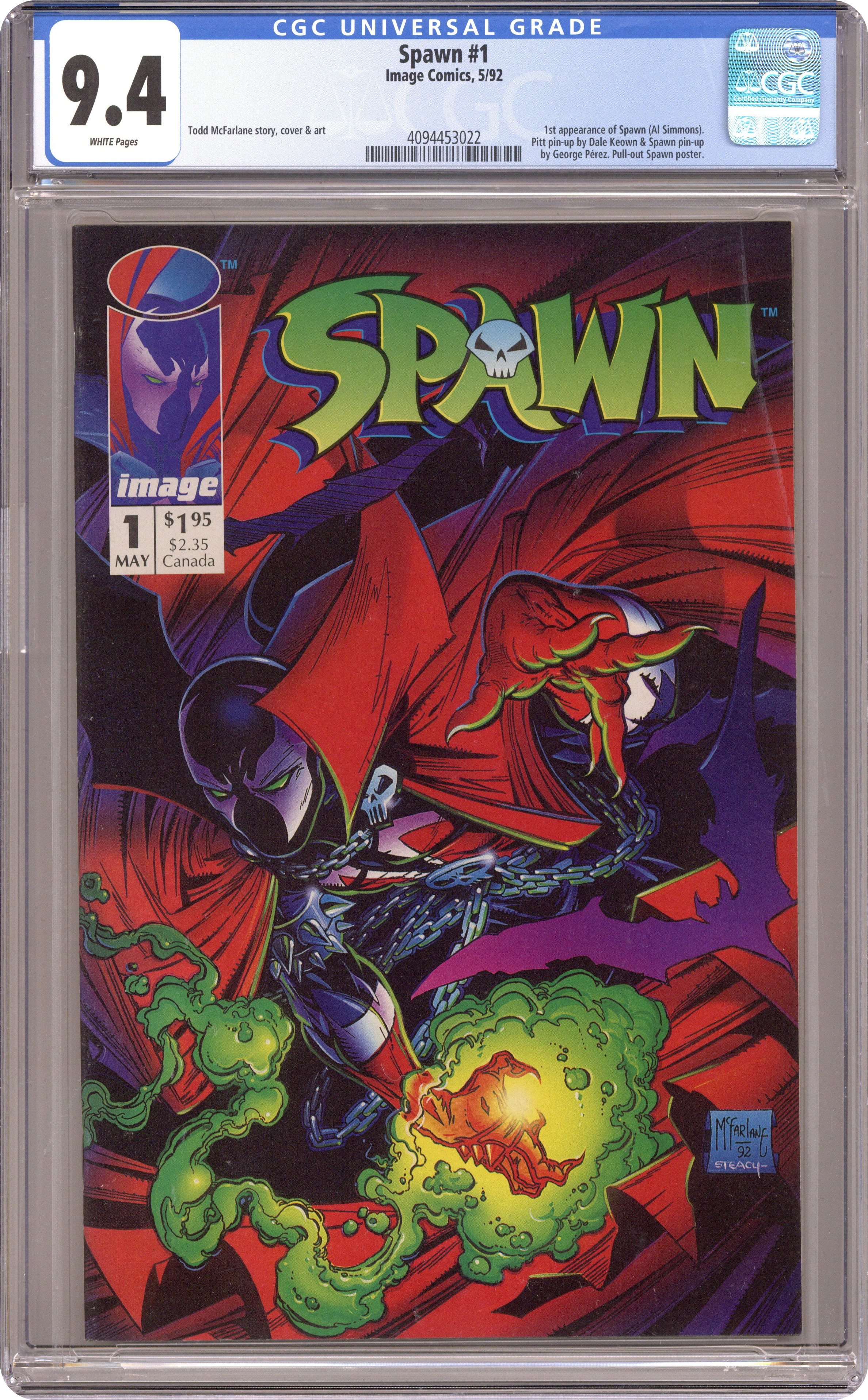 Direct edition. "Questions!" Part 1 of 4. Created, story, and art by Todd McFarlane. When government assassin Al Simmons is murdered, a deal with the devil brings him back to the realm of the living. But now he walks the shadows as the disfigured soldier of hell known as Spawn. Armed with unimaginable, but finite, magical abilities, Spawn is destined to play an important role in the upcoming Armageddon. But, what happens when this rebellious anti-hero decides he won't fight for either side? Superstar artist and Image co-founder, Todd McFarlane, creates a character who has gone on to inspire a major motion picture, an HBO animated series, numerous spin-off comic series, and one of the most successful toylines of all time. Spawn centerfold by Todd McFarlane & Ken Steacy. Pin-up of Spawn by George Perez. Pin-up of PITT by Dale Keown. Cover by McFarlane & Steacy. 1st app of Sam and Twitch Cover price $1.95. Grade: CGC 9.4 explanation of grade Condition: Used (collectible)