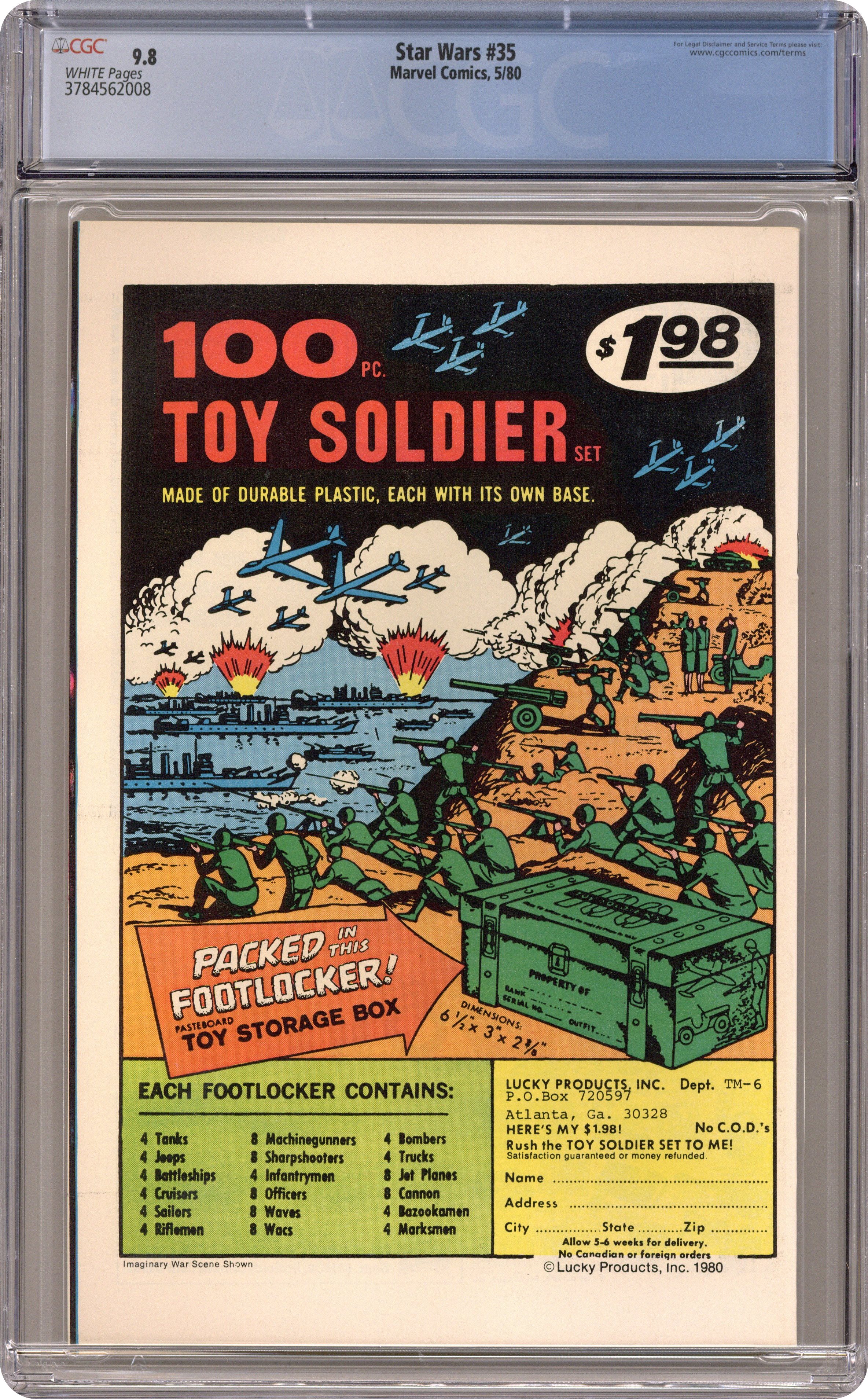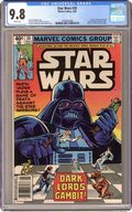 Direct Edition. "Dark Lord's Gambit!" Written by Archie Goodwin. Art by Carmine Infantino and Gene Day. Like pieces on the game board, the dark lord, Darth Vader, maneuvers the players into position for the coup de tat. The galaxy has just become a more dangerous place to be for the young Luke Skywalker, for the Sith Lord now knows the name of the man who thwarted him by destroying the Death Star. Cover price $0.40. Grade: CGC 9.8 explanation of grade Condition: Used (collectible)