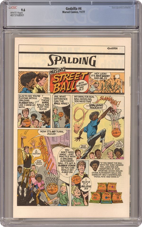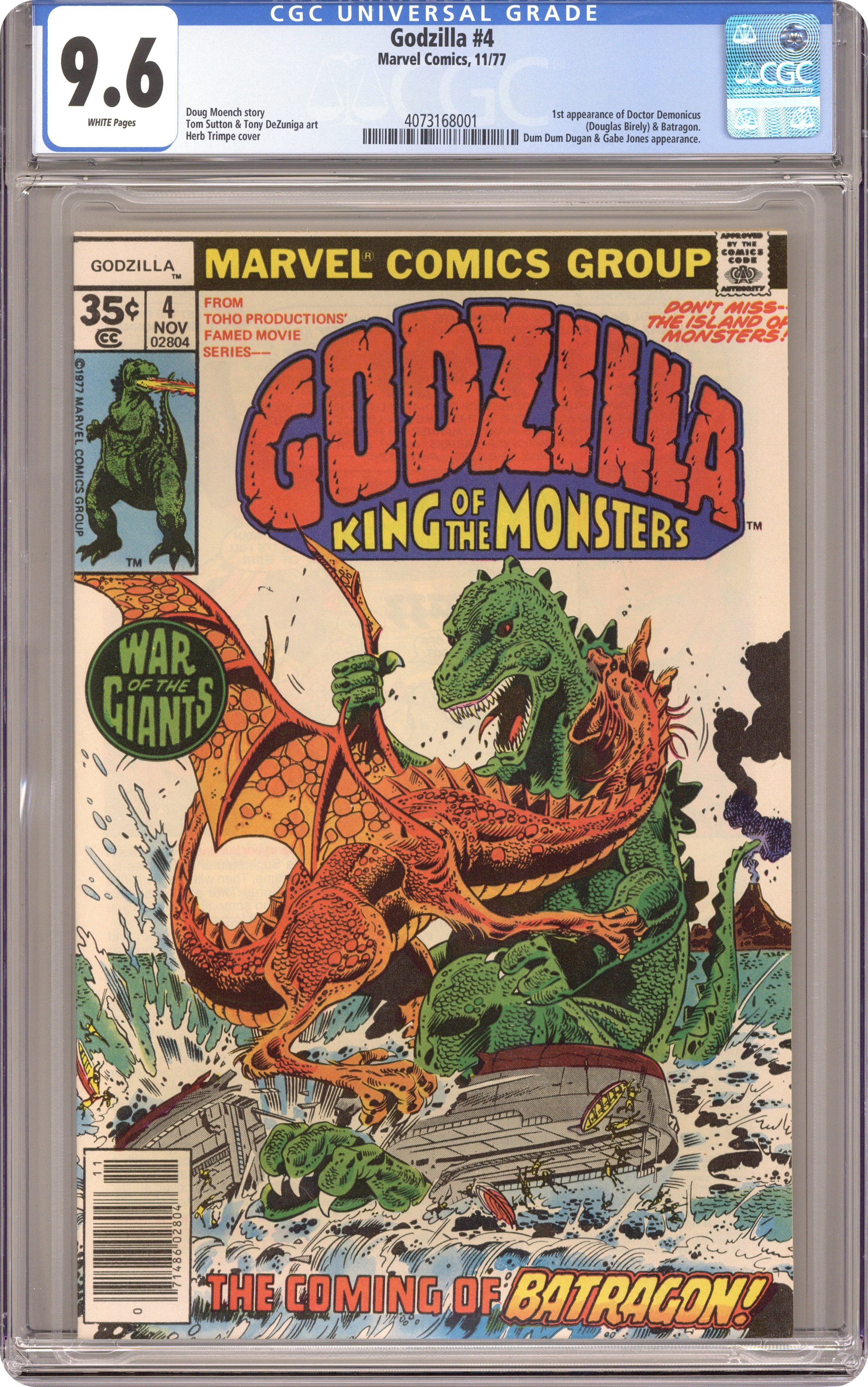 "Godzilla versus Batragon!" Part 1 of 2. Story by Doug Moench. Art by Tim Sutton and Tony DeZuniga. When the enormous creature known as Batragon begins attacking oil tankers at sea, the only thing that can stop the monster is the menace to humanity known as Godzilla. Plus, who is Dr. Demonicus and what is his diabolical plan for taking over the world. Cover price $0.35. Grade: CGC 9.6 explanation of grade Condition: Used (collectible)