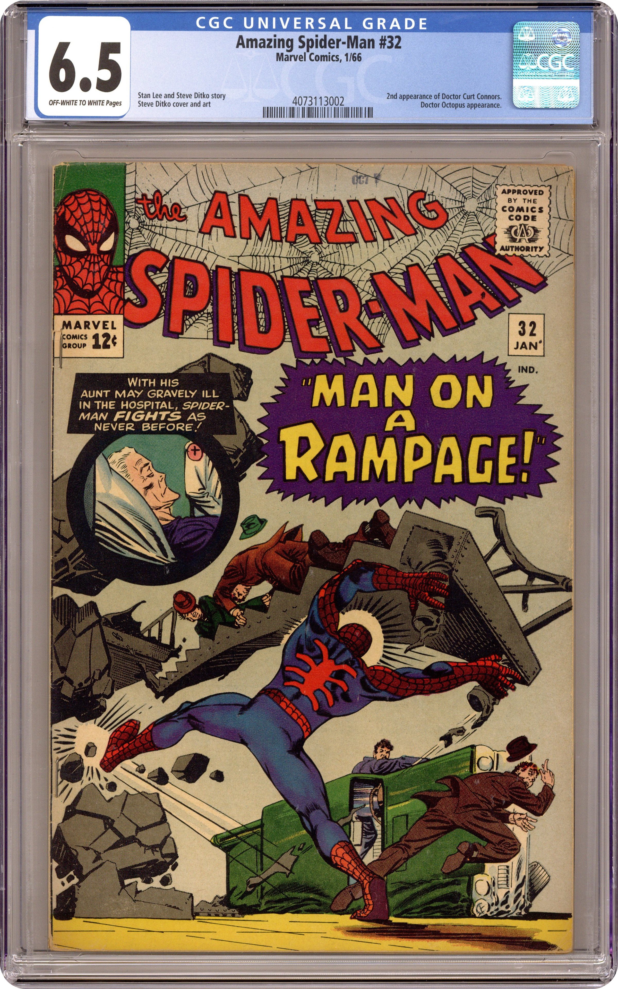 Ended Oct 13 2023 Winning Bid $85 Doctor Octopus (the Master Planner) in "Man on a Rampage." Script by Stan Lee, art and cover by Steve Ditko. In a battle with Doctor Octopus, Spider-Man gets trapped under tons of steel. Reprinted in Marvel Tales # 25 and 171. 36 pgs. Cover price $0.12. Grade: CGC 6.5 explanation of grade Condition: Used (collectible)