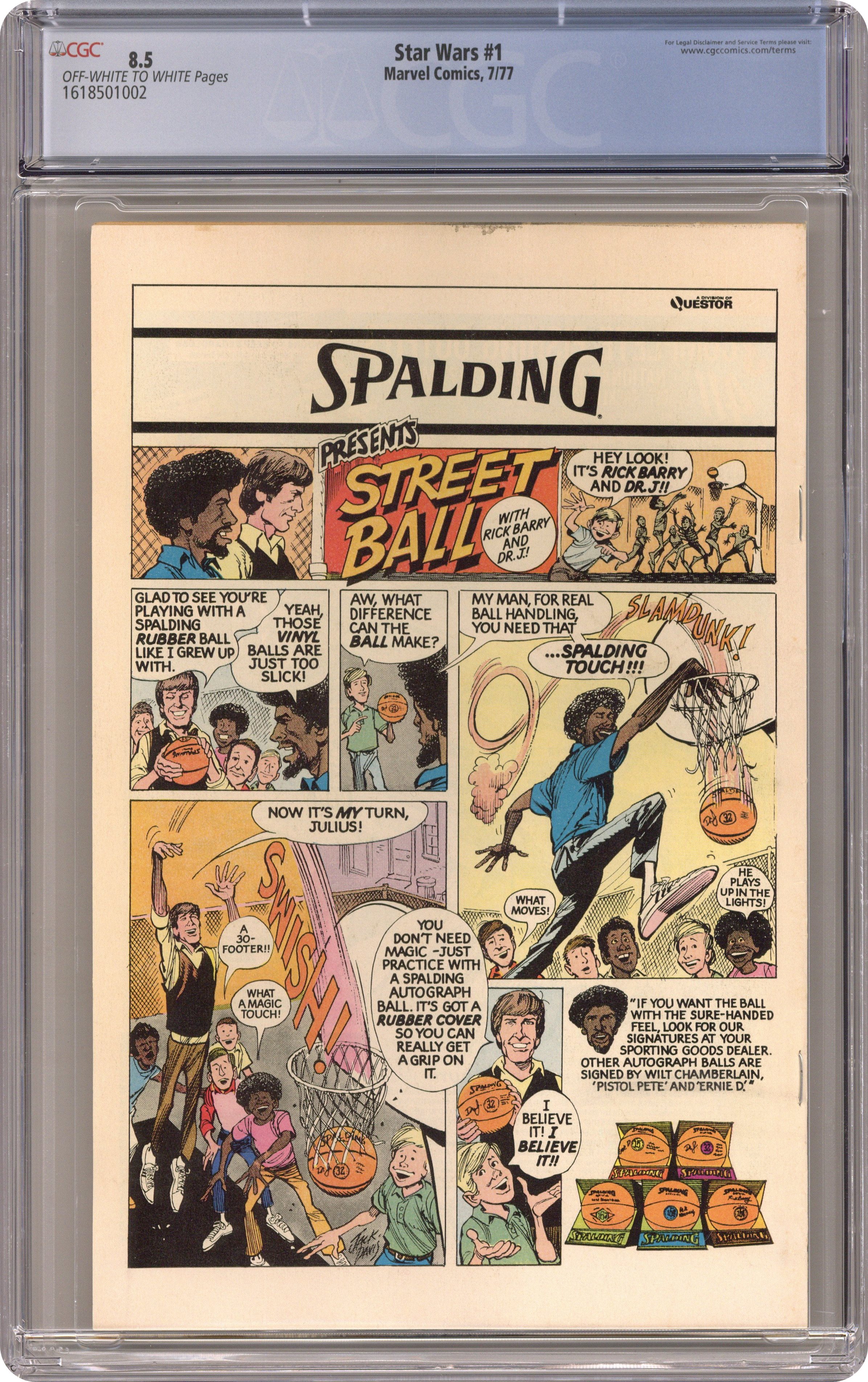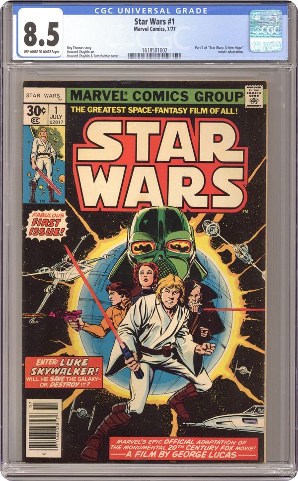 A Long time ago, in a galaxy far, far away...the galaxy is engrossed in an intergalactic civil war. A small band of freedom fighters led by Princess Leia opposes the evil Galactic Empire and steals the plans to their most destructive weapon, the Death Star. Darth Vader, the most feared name in the galaxy, will stop at nothing to recover those stolen plans and the location of the Rebel's secret base of operations. Now, it's up to farm boy Luke Skywalker and a motley band of heroes to save the Princess and the galaxy from the darkness that has engulfed it. Cover price $0.30. Grade: CGC 8.5 explanation of grade Condition: Used (collectible)If you add this item to your want list, we will email you when it becomes available.