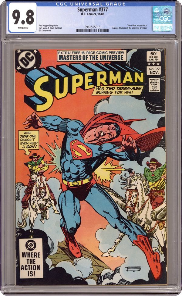 Cover art by Gil Kane. Terra Times Two!, script by Paul Kupperberg, pencils by Curt Swan, inks by Dave Hunt; Terra-Man lands on an alternate Earth where Magic exists instead of Science, meets his twin and the two Terra-Men decide to take on Superman. Fate Is The Killer featuring Masters Of The Universe, script by Paul Kupperberg, pencils by Curt Swan, inks by Dave Hunt; stars He-Man, Skeletor, and Superman. 52 Pages, Full Color. Cover price $0.60. Grade: CGC 9.8 explanation of grade Condition: Used (collectible)