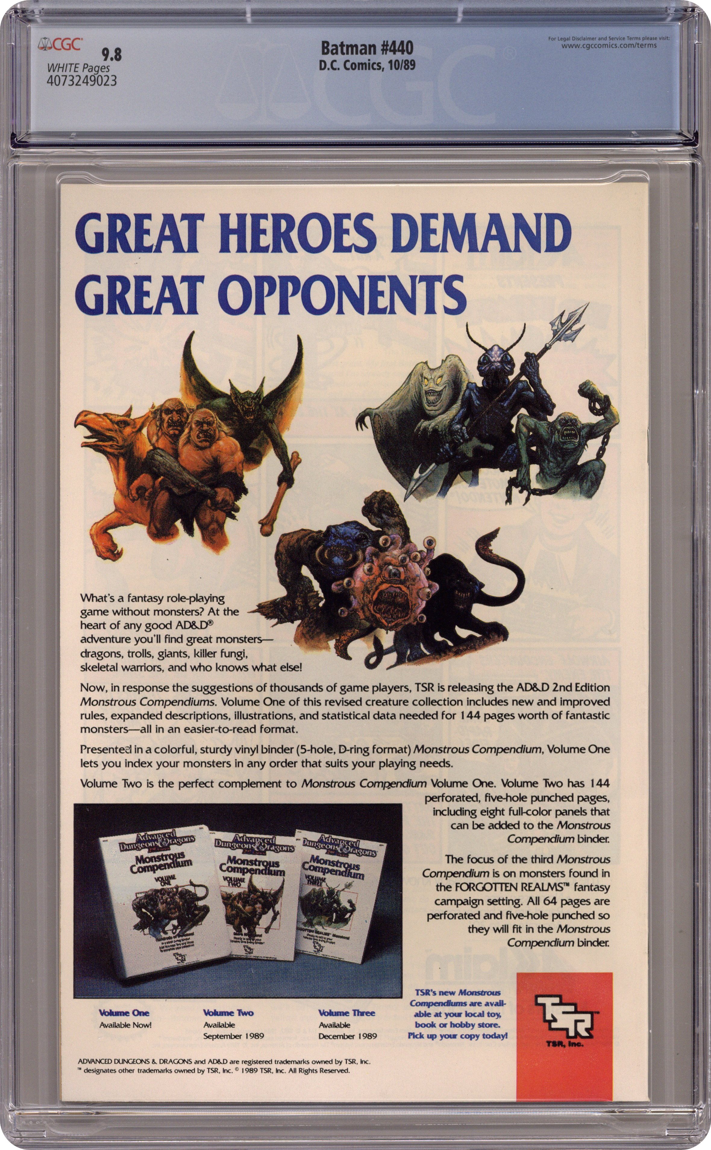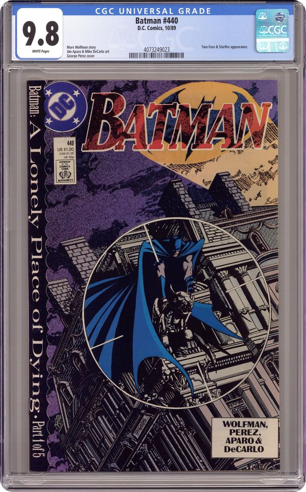 Cover by George Perez. "A Lonely Place of Dying Chapter One: Suspects," script by George Perez (Co-Plot) and Marv Wolfman, pencils by Jim Aparo, inks by Mike DeCarlo; Batman pushes the limits following Jason Todd's death; Meanwhile, a mysterious individual stalks Batman and Nightwing; Batman discovers that Two-Face is back in town and planning his demise. Continued in The New Titans (1988-1996) #60. A Lonely Place of Dying Part 1 of 5. 36 Pages, Full Color. Cover price $1.00. Grade: CGC 9.8 explanation of grade Condition: Used (collectible)