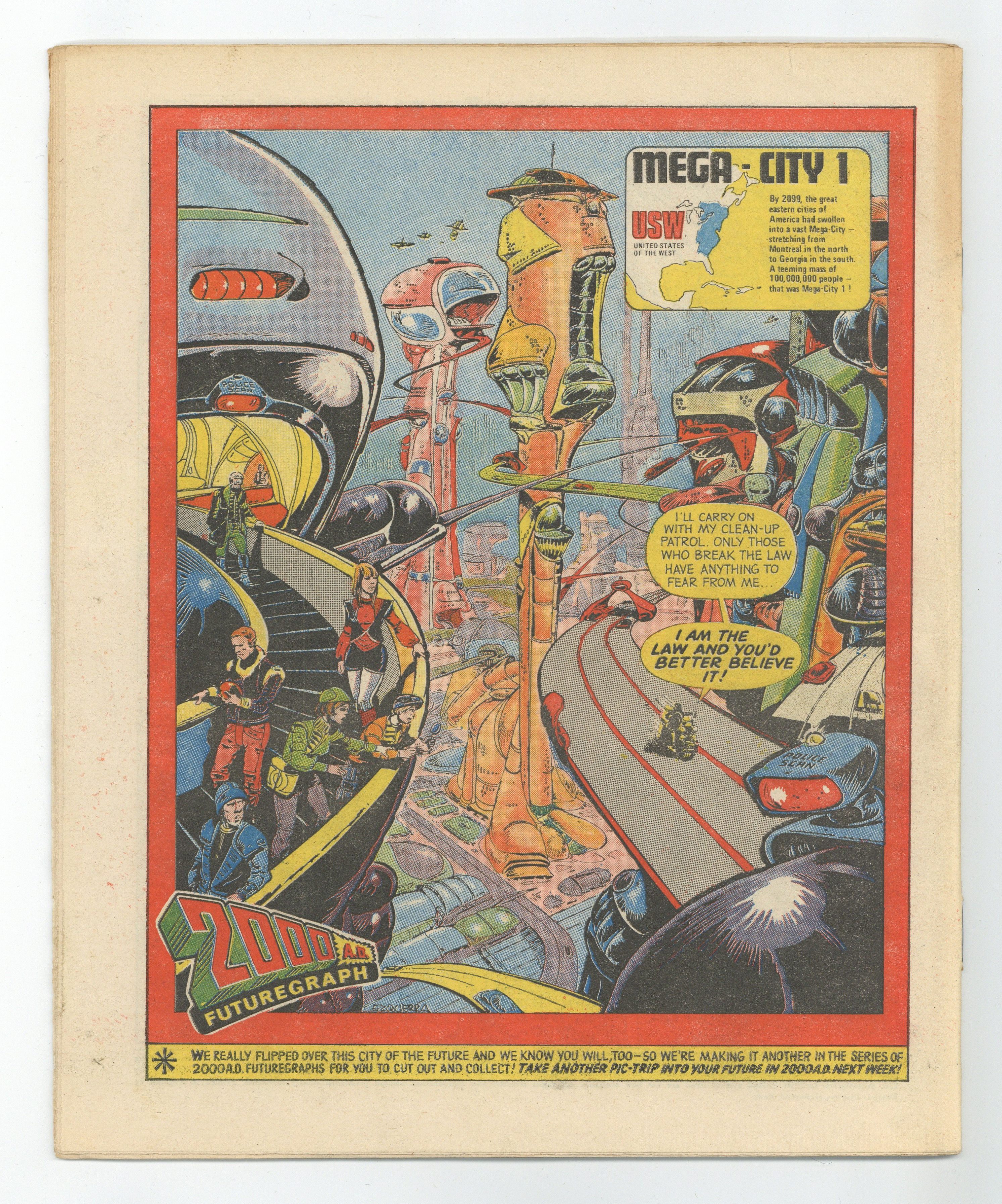 Ended Jul 17 2023 Winning Bid $306 2nd appearance Judge Dredd. Cover by Ramon Sola. Futuregraph Contains bonus Red Alert Survival Wallet. March 12, 1977. Prog: 03 Featuring Invasion "The Resistance" (Part 3 of 5), written by Gerry Finley-Day, art by Jesus Blasco; The mysterious stranger offers Bill Savage a position in the British Resistance; Savage has different ideas. Dan Dare (Part 3 of 11), written by Kelvin Gosnell, art by Massimo Belardinelli; The alien from Jupiter's red spot is immobilized, and one of the Odyssey's staff doctors exclaims they're "dealing with a creature not of ordinary flesh and blood". Monday and Dare descend to Jupiter to find out more. Judge Dredd in "The New You," written by Kelvin Gosnell, art by Mike McMahon; Lawbreaker Scarface gets a new face at a face-changing parlor, but is still apprehended by Judge Dredd when his voice print identifies him in ways his new face cannot. Flesh: Book 1 (Part 3 of 19), written by Ken Armstrong, art by Ramon Sola; Reagan saves Joe from the clutches of a female tyrannosaur, "more vicious than any male"; Careful, Reagan! "Old One Eye would be avenged!" Harlem Heroes (Part 3 of 27), written by Tom Tully, art by Dave Gibbons; In their first match after the deadly crash that killed most of the original Harlem Heroes, Zack overestimates his abilities during professional aeroball play. M.A.C.H.1 "Battleship," written by Nick Allen, art by Massimo Belardinelli; "A mysterious explosion sends a secret NATO mini-battleship to a watery grave" and it's up to John Probe to determine if a nearby eastern fishing trawler is secretly attempting a recovery mission. Judge Dredd illustration by Carlos Ezquerra. 32 Pgs., B&W. 0.08 GBP. Grade: FN- 5.5 explanation of grade Condition: Used (collectible)