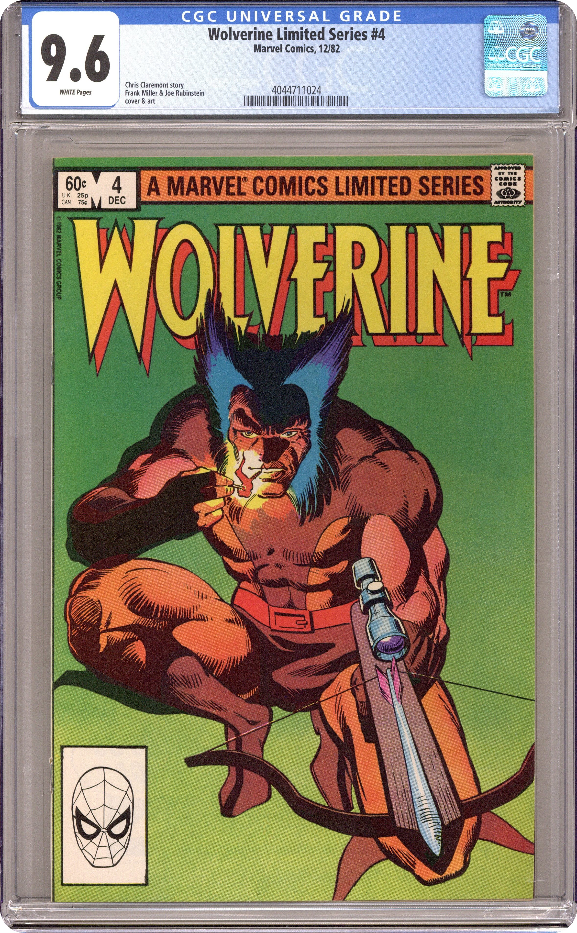 Direct Edition. Wolverine's Japanese adventure concludes in "Honor." Script by Chris Claremont, pencils by Frank Miller, inks by Joe Rubinstein. Miller/Rubinstein cover. Cover price $0.60. Grade: CGC 9.6 explanation of grade Condition: Used (collectible)