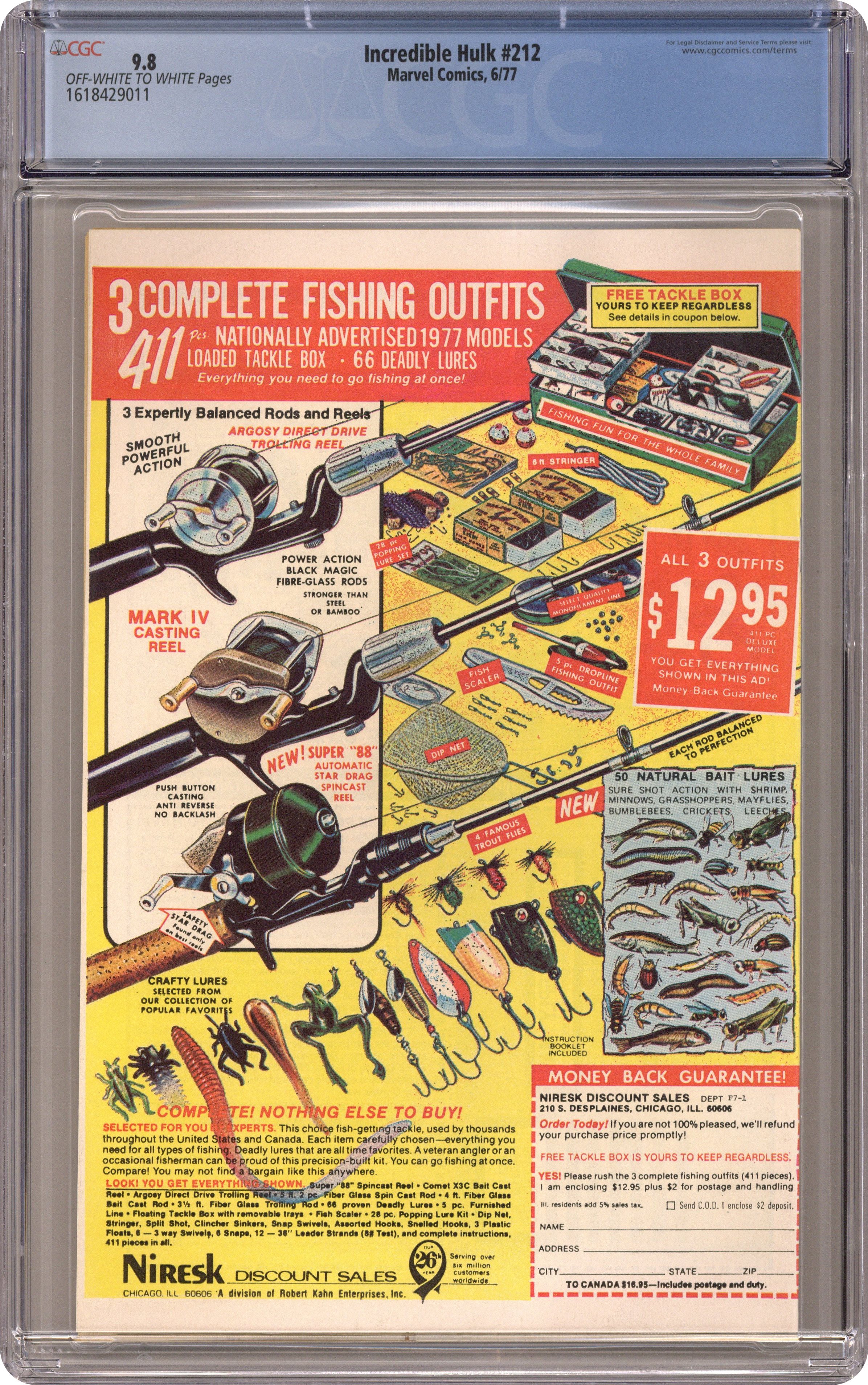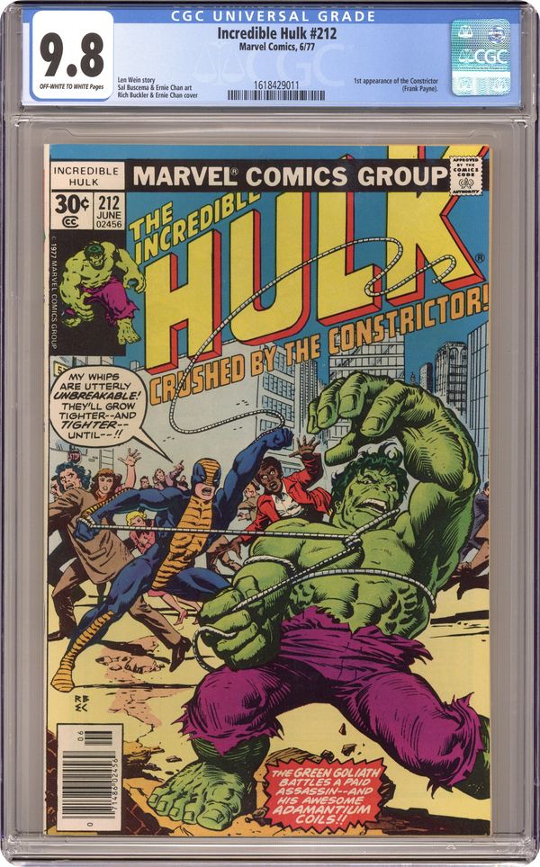 Cover pencils by Rich Buckler, inks by Ernie Chan. "Crushed By...the Constrictor!", script by Len Wein, pencils by Sal Buscema (breakdowns) and Ernie Chan (finished art), inks by Ernie Chan; In New York city, Jim Wilson calls Bruce Banner; But the Constrictor, a hired assassin, finds Jim first; Bruce gets just in time to turn into the Hulk and protect his friend; Though the Constrictor uses his adamantium ropes to hurt the green giant, he's defeated by the Hulk; Meanwhile, Betty Ross changes her appearance and starts her new life; Nick Fury appearance. 36 pgs., full color. $0.30. Cover price $0.30. Grade: CGC 9.8 explanation of grade Condition: Used (collectible)