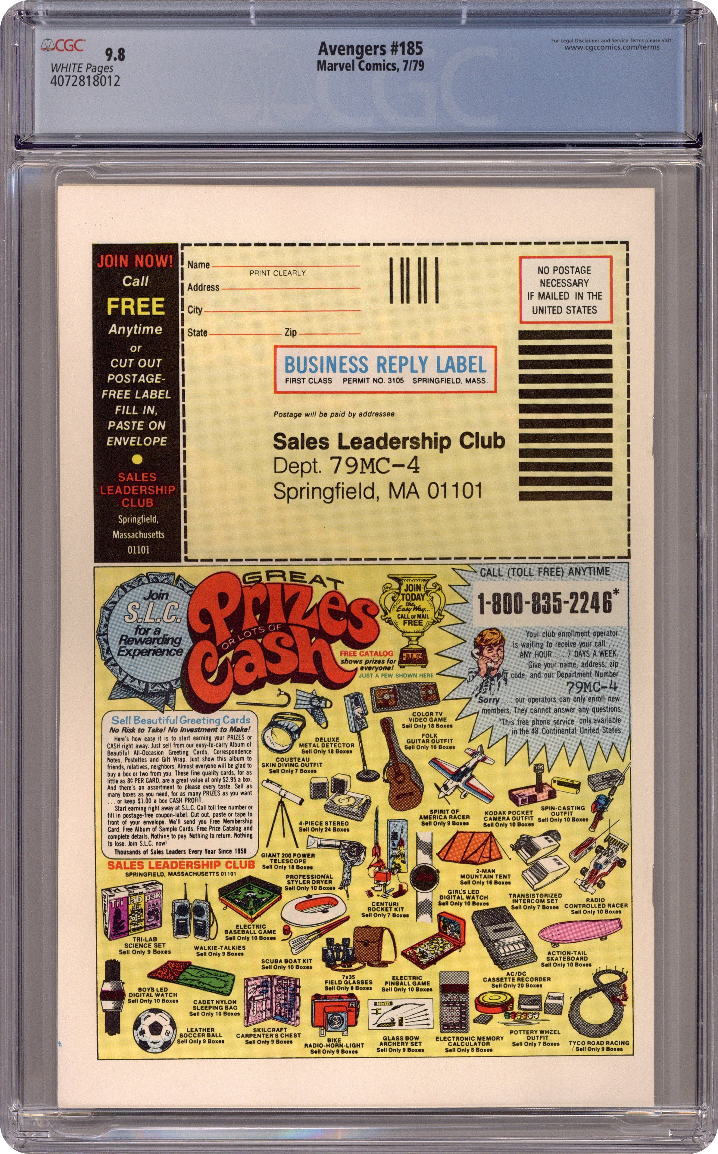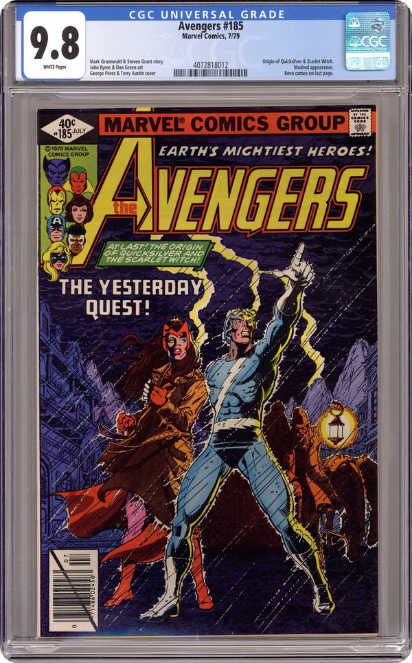 Direct Edition. "The Yesterday Quest!" Part 1 of 3. Plot by Mark Gruenwald and Steven Grant. Script by David Michelinie. Pencils by John Byrne. Inks by Dan Green. Cover by George Perez and Terry Austin. Ever since their first appearance in Uncanny X-Men 4 many years ago, the origin of Quicksilver and the Scarlet Witch has been a mystery to both comic readers and the siblings alike. After Wanda and Pietro arrive in Transia with Django Maximoff, clues to the twins' birthplace and birth parents begin to emerge. Modred the Mystic, the Darkhold, Bova the cow-woman, the High Evolutionary's former citadel, and Wundagore Mountain are all pieces to the puzzle. And the truth seems to lie at the top of the mountain. But there's something else at the top of Wundagore Mountain. Something ancient, something evil. Cameo appearance by Bova. Flashback cameos by Robert Frank, Madeline Frank, and the Toad. Avengers Lineup: Beast, Captain America, Falcon, Hawkeye, Iron Man, Jocasta, Ms. Marvel, Quicksilver, Scarlet Witch, Vision, and the Wasp. (Notes: Mark Gruenwald's participation in this three-part story was an indication of the storyline's importance to the continuity of the Marvel Universe. Modred previously appeared in Marvel Two-in-One 33. This issue includes a full-page ad for the Man-Thing's guest appearance in Micronauts 7.) 36 pages Cover price $0.40. Grade: CGC 9.8 explanation of grade Condition: Used (collectible)