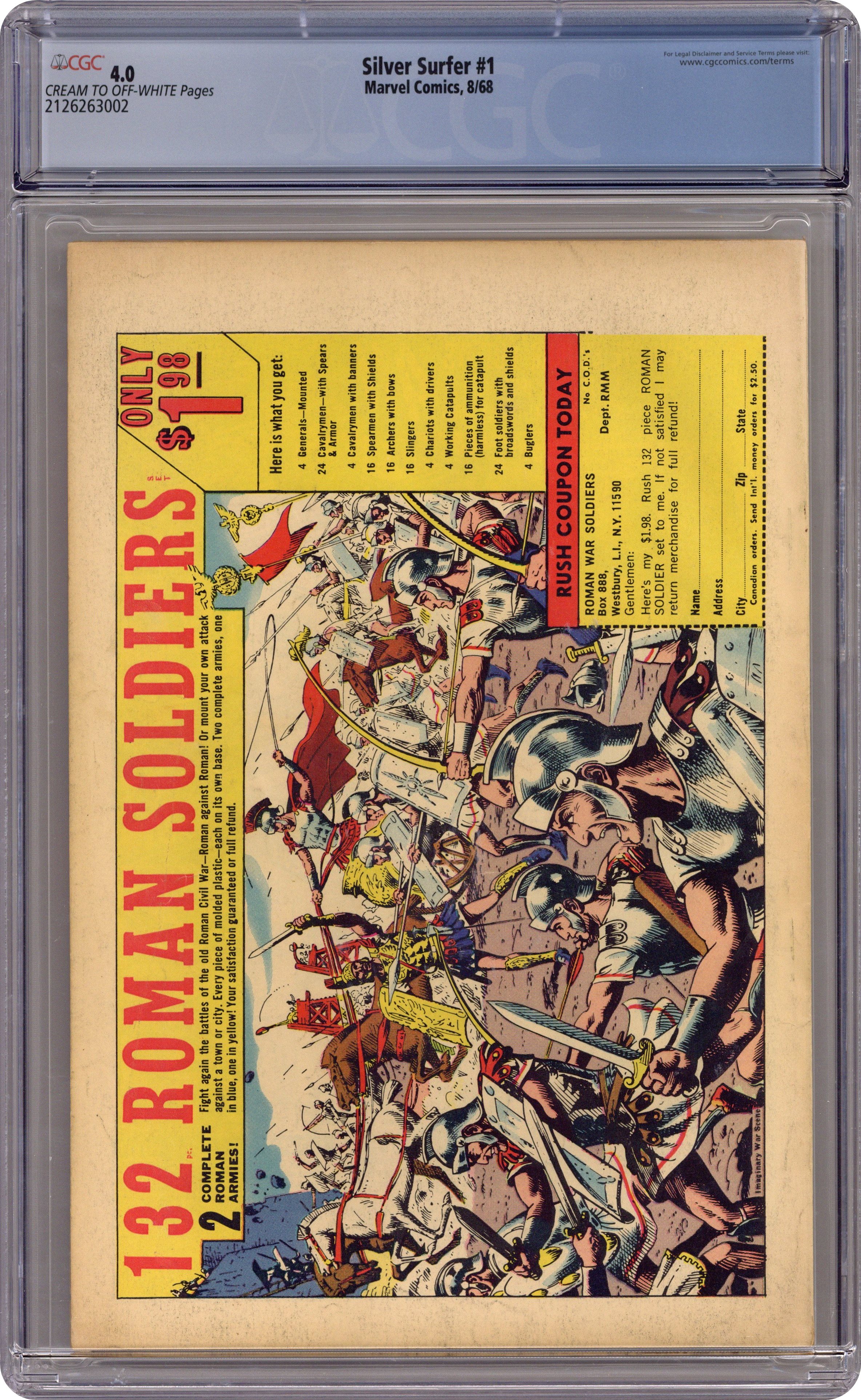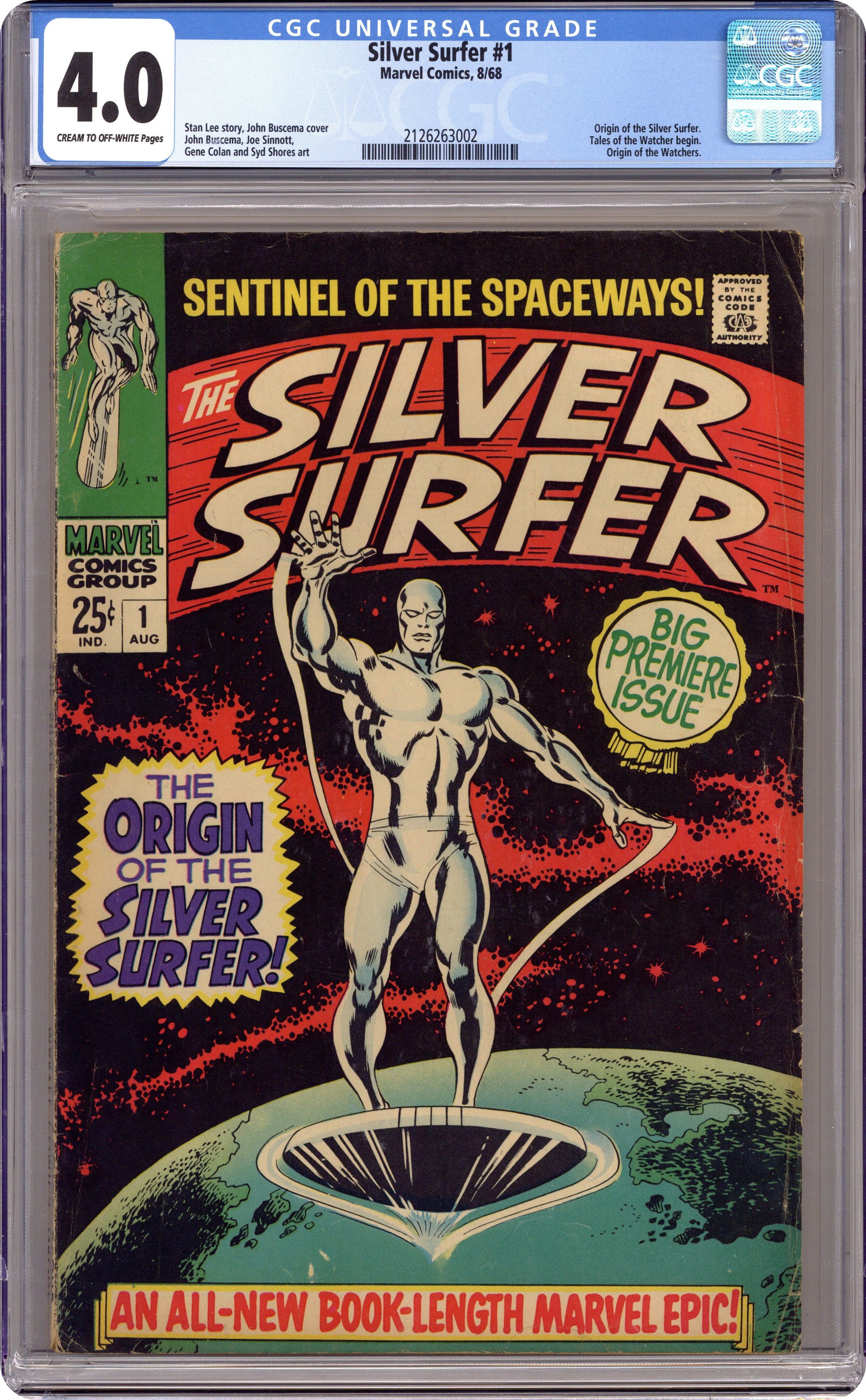 "The Origin of the Silver Surfer!" Cameos by the Incredible Hulk, Doctor Doom, and the Fantastic Four. Written by Stan Lee. Art and cover by John Buscema and Joe Sinnott. Many years ago, in order to prevent the total annihilation of his civilization and homeworld, Norrin Radd bargained with the Devourer of Worlds. Imbued with the Power Cosmic, he became the Silver Surfer and Herald of Galactus. However, on the fateful day he arrived on Earth, for love of humanity, he betrayed his master, and thus was cursed to never traverse the space-ways again. This is his story. Includes the Watcher back-up "The Wonder of the Watcher!" Story by Stan Lee. Art by Gene Colan and Syd Shores. 68-page giant. Cover price $0.25. Grade: CGC 4.0 explanation of grade Condition: Used (collectible)