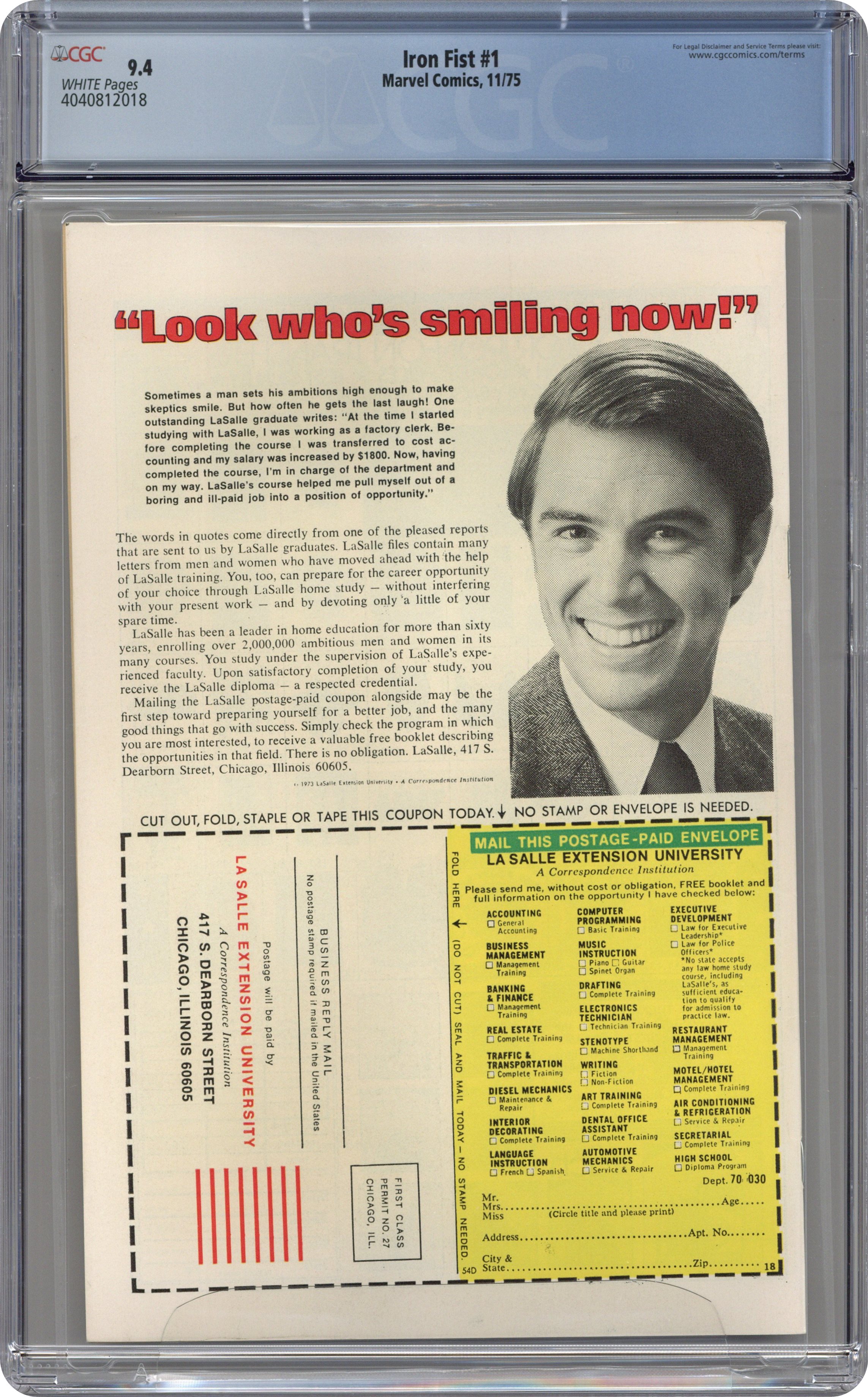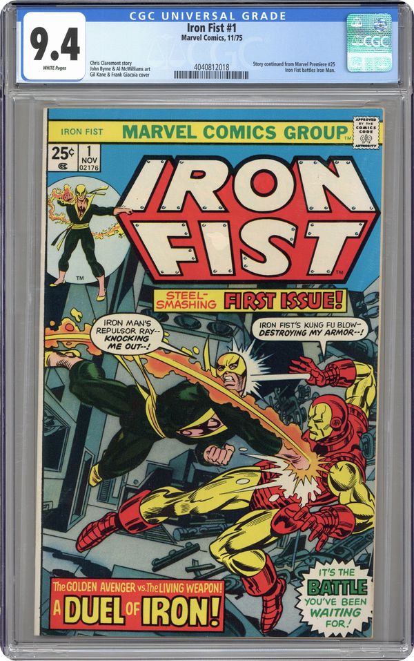 "A Duel of Iron!" Guest-starring Iron Man and Misty Knight. Story by Chris Claremont. Art by John Byrne and Al Williams. Story continued from Marvel Premiere #25. Daniel Rand was reborn in the fires of a dragon's heart in the mystical land of K'un Lun. Now, he is the living weapon known as Iron Fist, finally in his own series. Hot on the trail of Colleen Wing's kidnappers, Iron Fist has come to Stark International seeking answers. Wanted by the police for a murder he did not commit, Danny comes face-to-face with the Invincible Iron Man, and Shell Head is in no mood to give a wanted man the benefit of the doubt. It's the Golden Avenger vs. the Living Weapon. Marvel Value Stamp. Cover price $0.25. Grade: CGC 9.4 explanation of grade Condition: Used (collectible)
