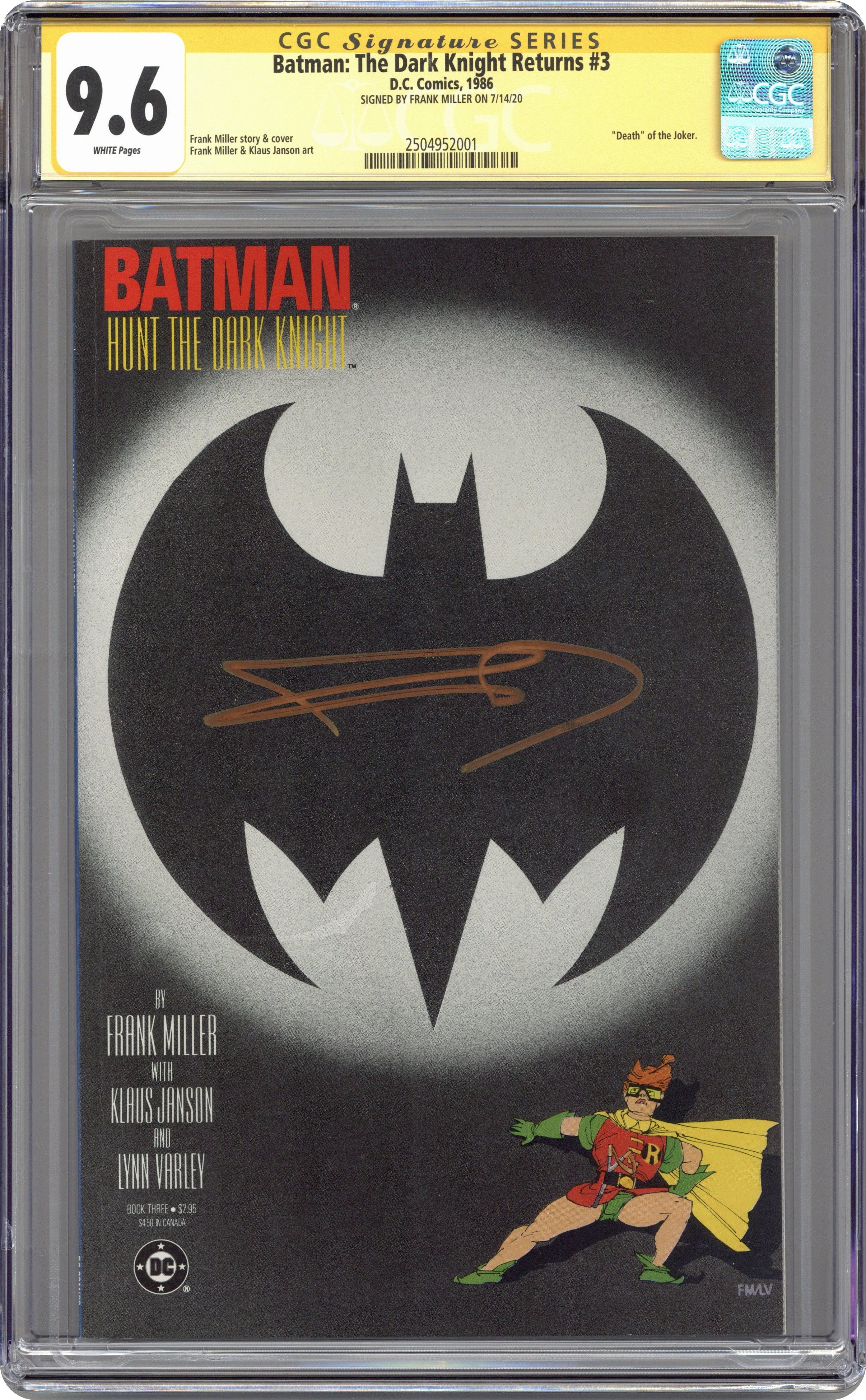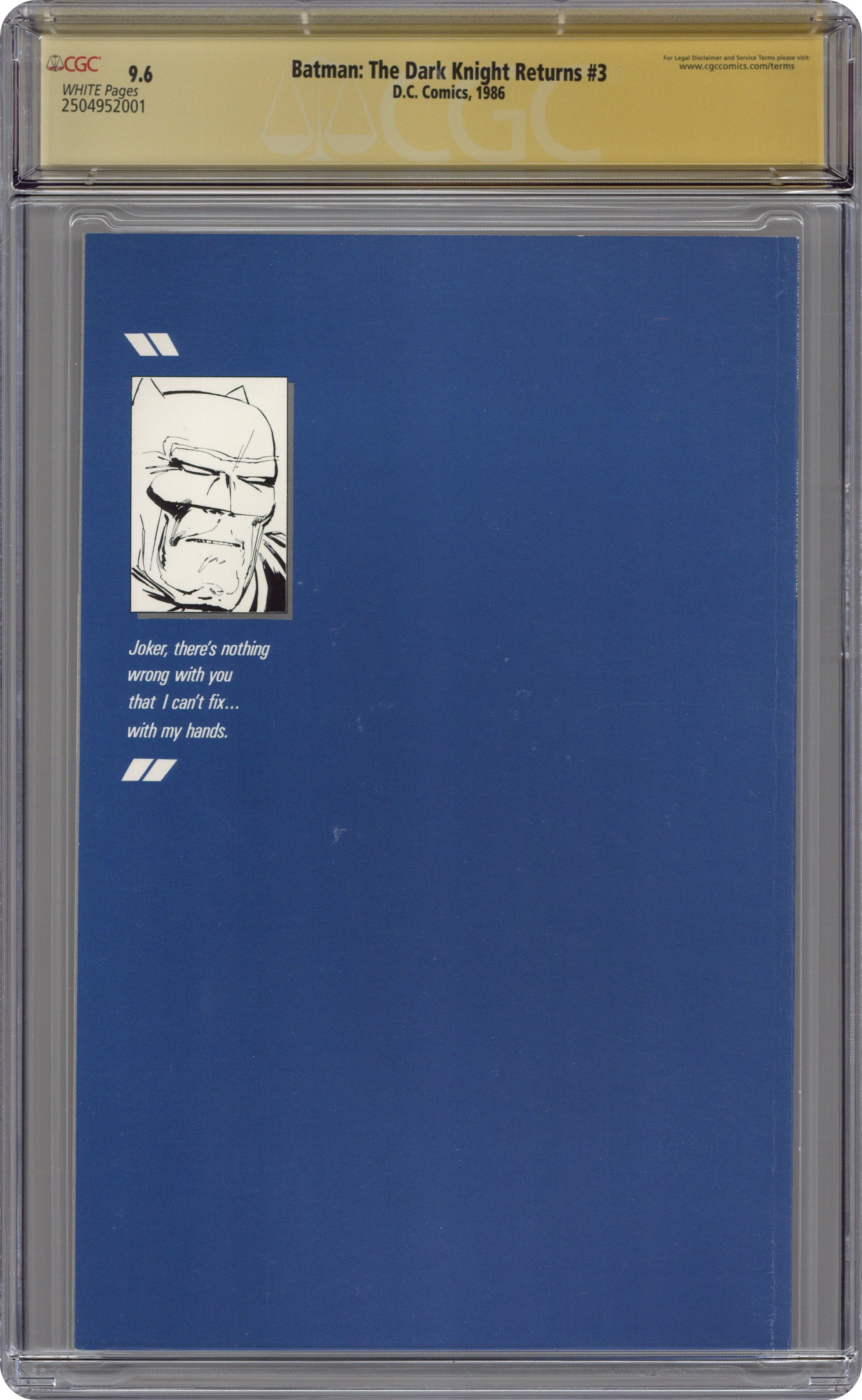 1st printing. NOTE: 2nd printing of #3 is clearly labeled as such on the inside cover. "Hunt The Dark Knight," script and pencils by Frank Miller, inks by Klaus Janson and Frank Miller; Batman battles the Joker, who has convinced his psychiatrist, Dr. Bartholomew Wolper, that he is sane and regretful; Seeking to discredit Batman, Wolper exhibits the Joker on a late-night show ("David Endochrine", parodying Late Night with David Letterman) to try and show that the Joker is actually a victim of Batman's own psychosis; As the police attack Batman, the Joker murders everyone in the studio; Batman follows him to Selina Kyle's place, where the former Catwoman has become a depressed alcoholic; Superman is introduced as an undercover agent for the American government. 52 pgs., full color. Cover price $2.95. Grade: CGC 9.6 explanation of grade Condition: Used (collectible)