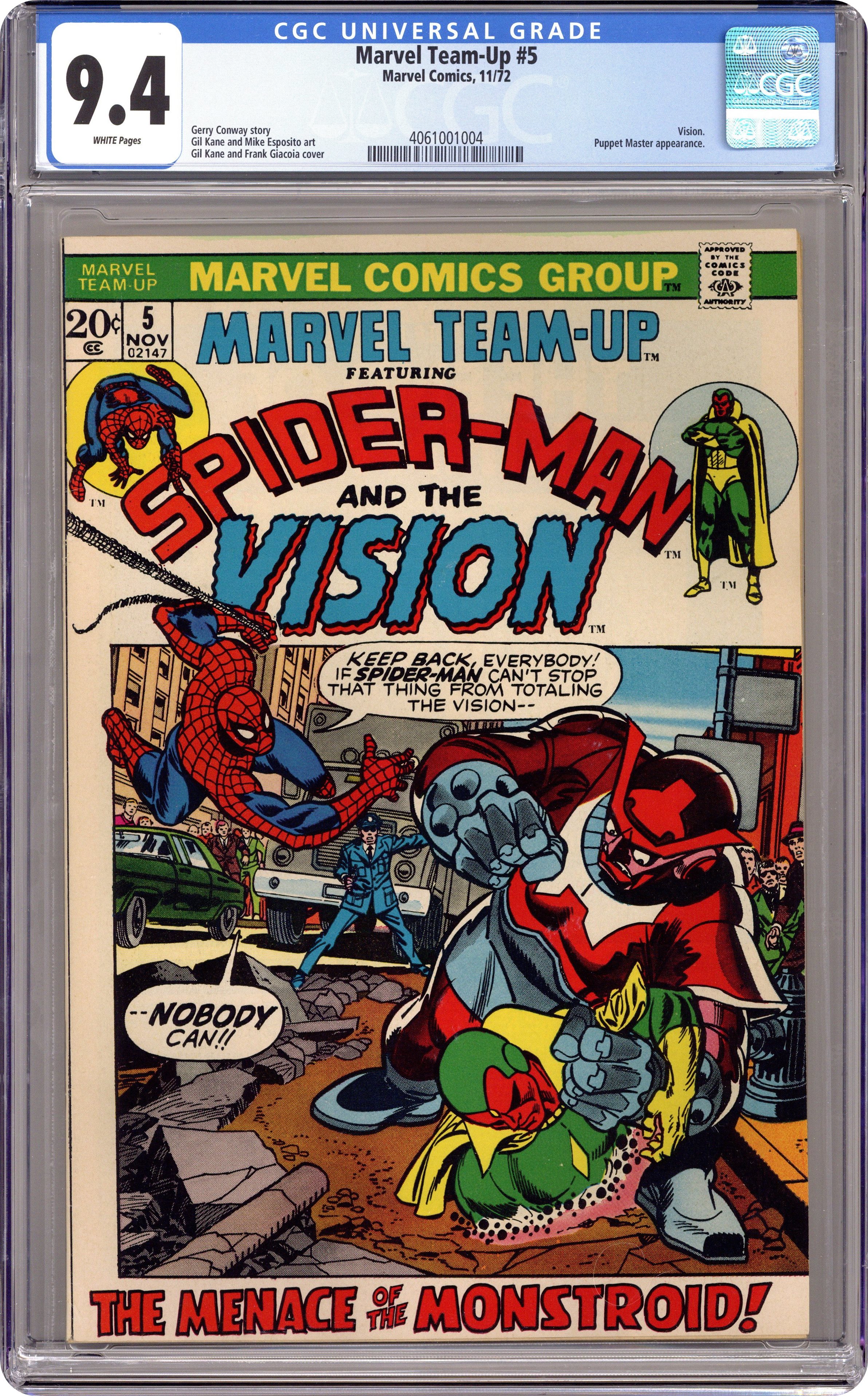 "A Passion of the Mind!" Guest-starring Spider-Man and the Vision. Script by Gerry Conway. Pencils by Gil Kane. Inks by Mike Esposito. Cover by Gil Kane and Frank Giacoia. While web-slinging across Manhattan, Spider-Man discovers a man stumbling in the streets below. And to the wall-crawler's surprise...it's the Vision! What's wrong with the synthezoid avenger? It appears that an electromagnetic signal from the Baxter Building is interfering with the Vision's brain waves! So, the two heroes travel to the FF's headquarters -- where they find the signal and the Puppet Master! Cameo appearance by Harry Osborn. (Note: The Puppet Master previously appeared in Fantastic Four 100.) 36 pages. Cover price $0.20. Grade: CGC 9.4 explanation of grade Condition: Used (collectible)