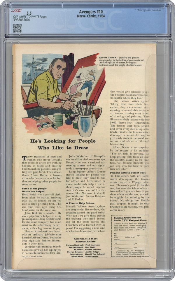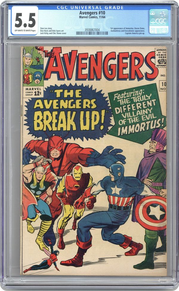 Ended Oct 20 2023 Winning Bid $135 Cover pencils by Jack Kirby, inks by Chic Stone. First appearance of Immortus in "The Avengers Break Up!", script by Stan Lee, pencils by Don Heck, inks by Dick Ayers; Immortus appears before the Masters of Evil and demands to join them against the Avengers, using his control of the realm of Limbo to summon other powerful people from past ages to help them. Roster: Captain America, Thor, Iron Man, Wasp, Giant-Man, and Rick Jones. Villains: the Executioner, the Enchantress, Baron Zemo, and Kang. Letter to the editor from comics artist Gene Day. 36 pgs., full color. NOTE: The initial printing of Avengers #10 had an error where magenta was applied to the yellow color plate causing a miscoloring of the cover. Cover price $0.12. Grade: CGC 5.5 explanation of grade Condition: Used (collectible)